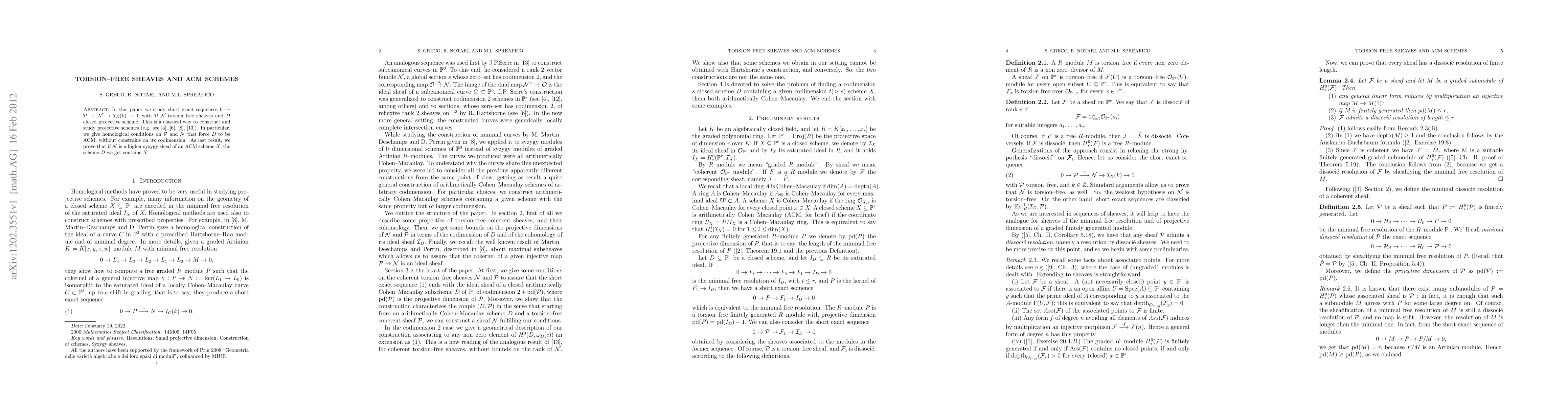 This paper explores short exact sequences involving torsion-free sheaves to construct and study projective schemes, providing homological conditions that ensure the resulting scheme is ACM without restricting its codimension. It also proves that a higher syzygy sheaf of an ACM scheme embeds within the resulting scheme.