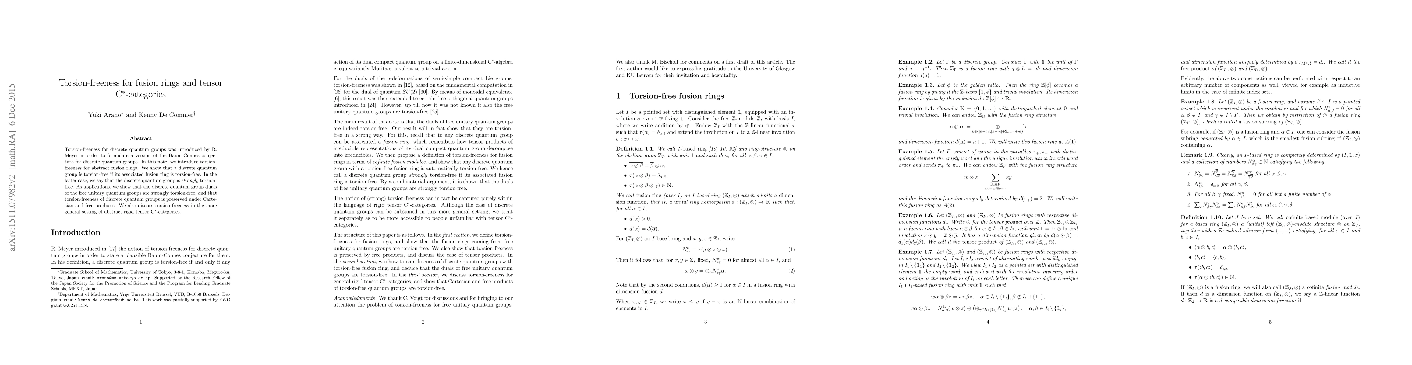 This paper introduces torsion-freeness for abstract fusion rings and shows that discrete quantum groups are torsion-free if their associated fusion rings are torsion-free. It demonstrates that duals of free unitary quantum groups and the property of torsion-freeness are preserved under Cartesian and free products.