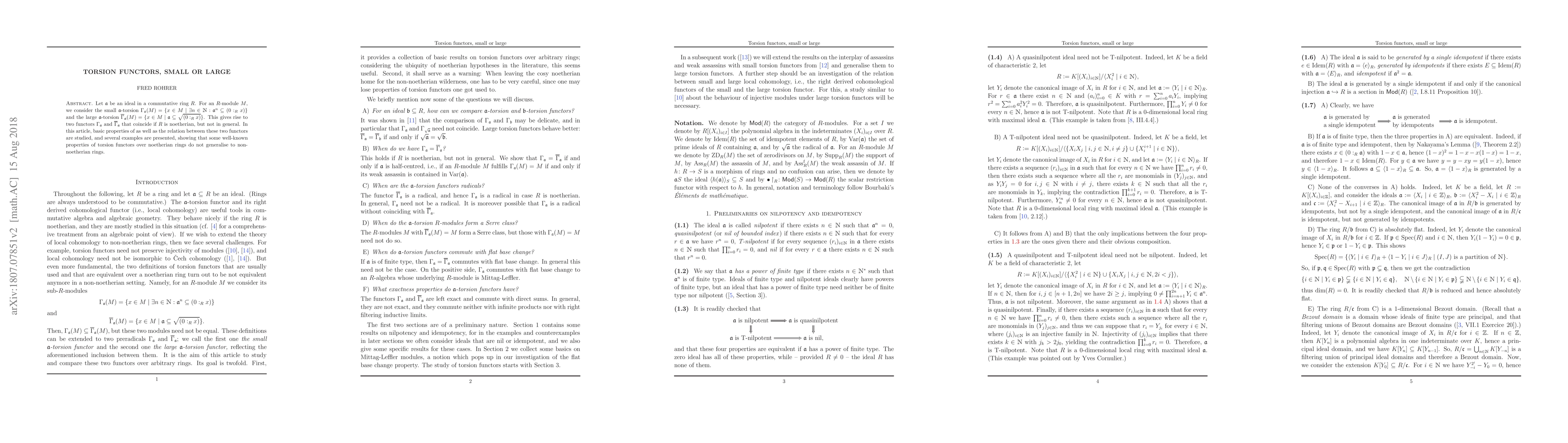 This paper investigates the properties and relationships between small and large $\mathfrak{a}$-torsion functors in the context of commutative rings, highlighting that while they coincide in Noetherian rings, they differ in general, and provides examples to illustrate this distinction.