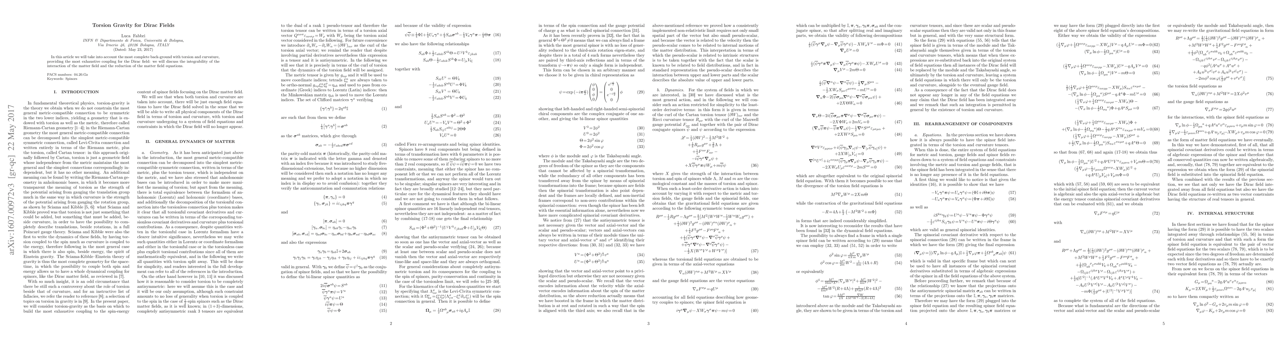 In this article we will take into account the most complete back-ground with torsion and curvature, providing the most exhaustive coupling for the Dirac field: we will discuss the integrability of the interaction of the matter field and the reduction of the matter field equations.