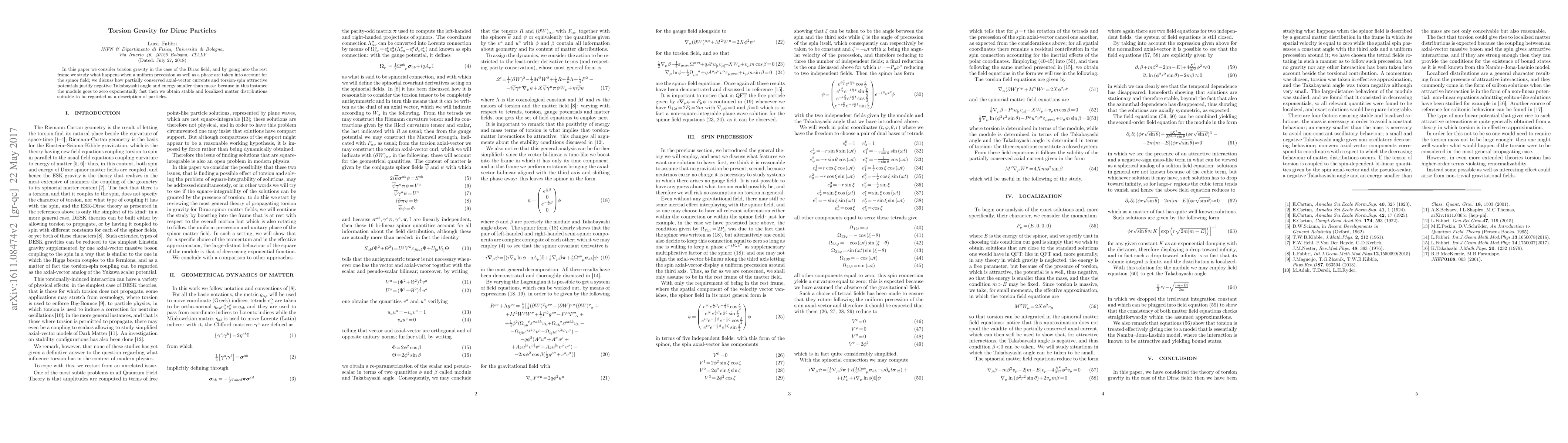 In this paper we consider torsion gravity in the case of the Dirac field, and by going into the rest frame we study what happens when a uniform precession as well as a phase are taken into account for the spinor field; we discuss how partially conserved axial-vector currents and torsion-spin attractive potentials justify negative Takabayashi angle and energy smaller than mass: because in this instance the module goes to zero exponentially fast then we obtain stable and localized matter distributions suitable to be regarded as a description of particles.