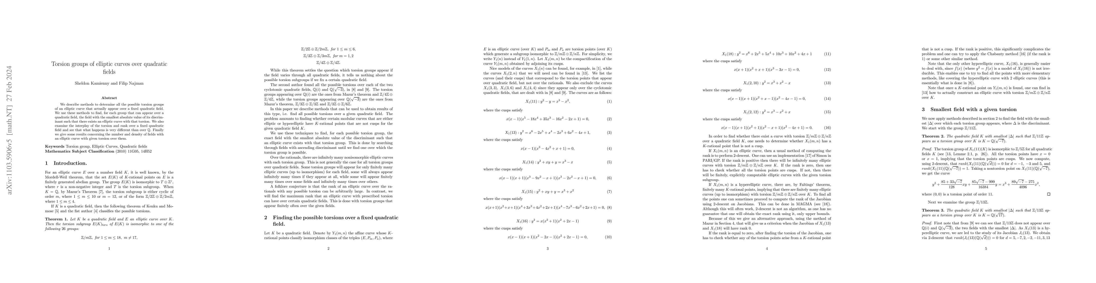 A combination of computational number theory and algebraic geometry techniques were used to study the properties of elliptic curves over quadratic fields.