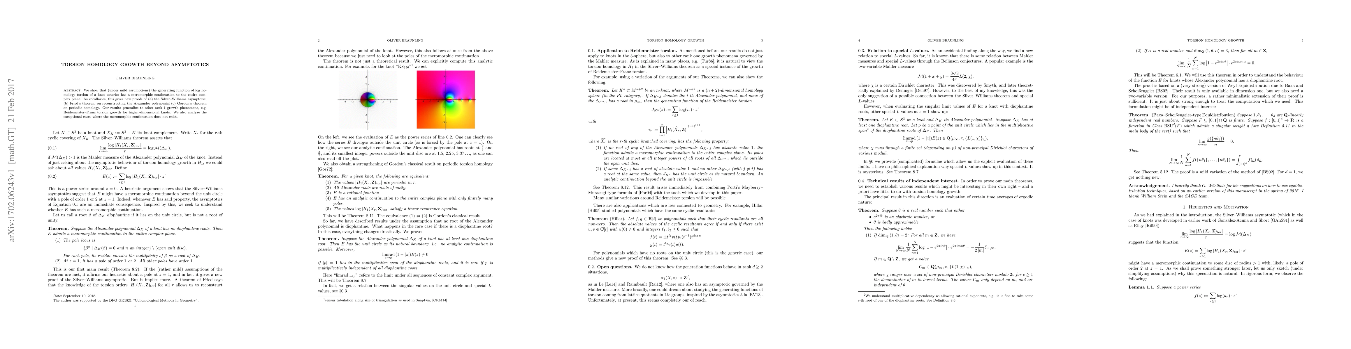 We show that (under mild assumptions) the generating function of log homology torsion of a knot exterior has a meromorphic continuation to the entire complex plane. As corollaries, this gives new proofs of (a) the Silver-Williams asymptotic, (b) Fried's theorem on reconstructing the Alexander polynomial (c) Gordon's theorem on periodic homology. Our results generalize to other rank 1 growth phenomena, e.g. Reidemeister-Franz torsion growth for higher-dimensional knots. We also analyze the exceptional cases where the meromorphic continuation does not exist.