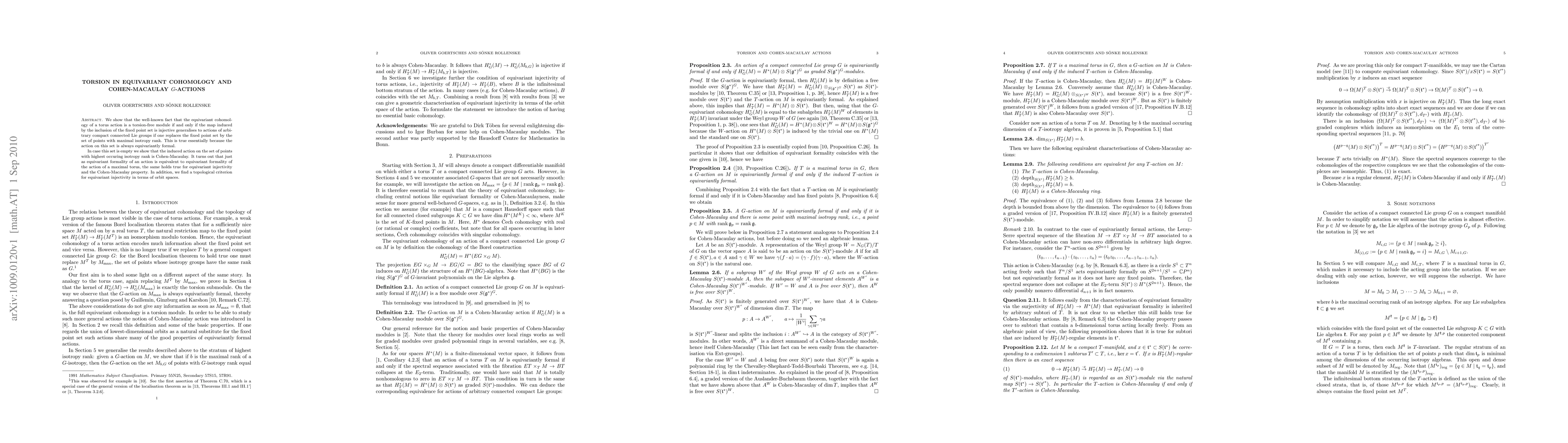 This paper extends a known result about equivariant cohomology torsion-freeness to actions of arbitrary compact connected Lie groups. It introduces a new criterion based on the set of points with maximal isotropy rank, proving this set's action is always equivariantly formal. The research also reveals a topological condition for equivariant injectivity, connecting it to the Cohen-Macaulay property and maximal torus actions.