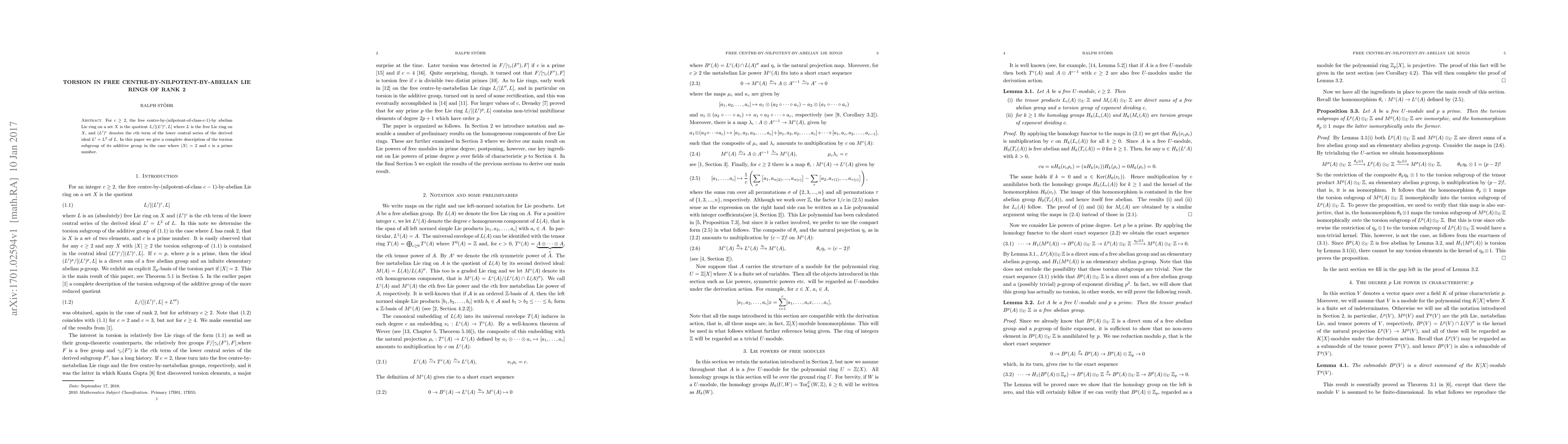 For $c\geq 2$, the free centre-by-(nilpotent-of-class-c-1)-by abelian Lie ring on a set $X$ is the quotient $L/[(L')^c,L]$ where $L$ is the free Lie ring on $X$, and $(L')^c$ denotes the $c$th term of the lower central series of the derived ideal $L'=L^2$ of $L$. In this paper we give a complete description of the torsion subgroup of its additive group in the case where $|X|=2$ and $c$ is a prime number.