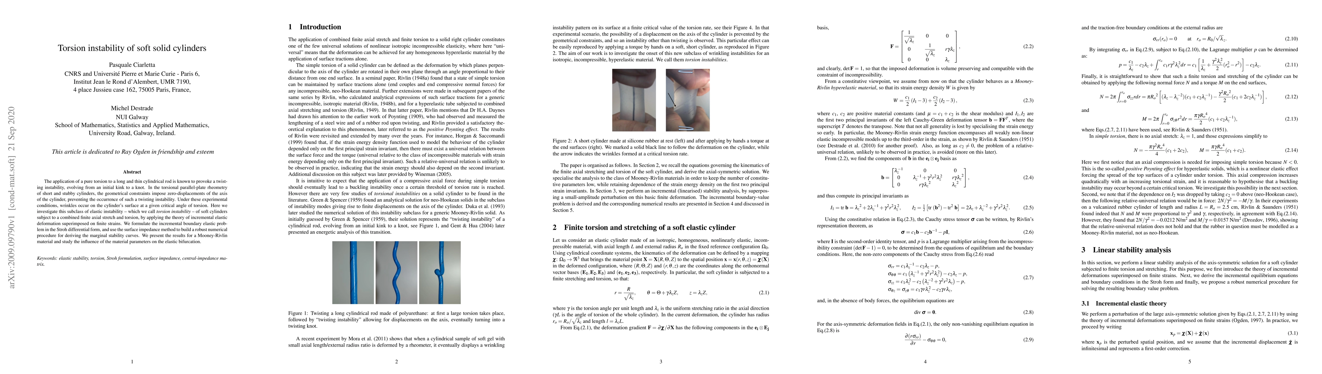This paper investigates the torsion instability of soft solid cylinders under combined axial stretch and torsion, using incremental elastic deformation theory. It formulates the problem in the Stroh differential form and employs numerical methods to derive stability curves, focusing on a Mooney-Rivlin material and analyzing the impact of material parameters on elastic bifurcation.