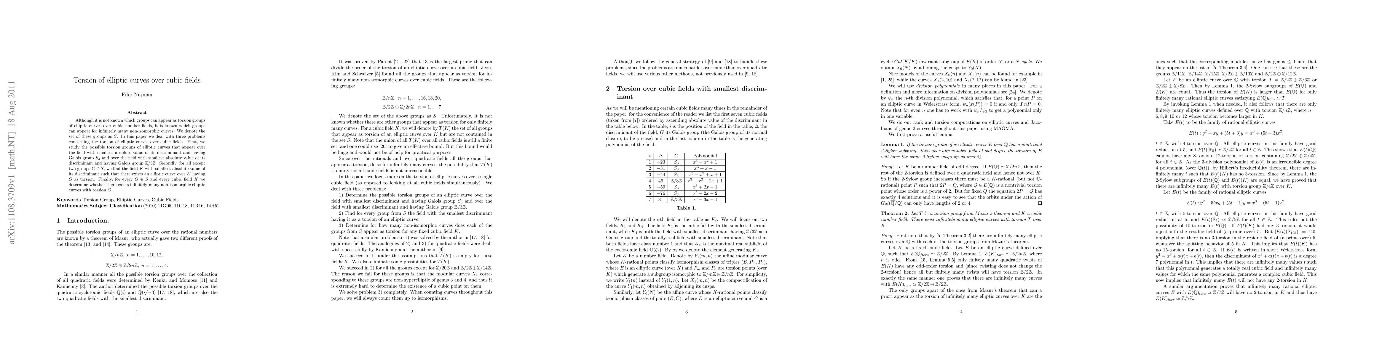 Although it is not known which groups can appear as torsion groups of elliptic curves over cubic number fields, it is known which groups can appear for infinitely many non-isomorphic curves. We denote the set of these groups as $S$. In this paper we deal with three problems concerning the torsion of elliptic curves over cubic fields. First, we study the possible torsion groups of elliptic curves that appear over the field with smallest absolute value of its discriminant and having Galois group $S_3$ and over the field with smallest absolute value of its discriminant and having Galois group $\Z/3\Z$. Secondly, for all except two groups $G\in S$, we find the field $K$ with smallest absolute value of its discriminant such that there exists an elliptic curve over $K$ having $G$ as torsion. Finally, for every $G\in S$ and every cubic field $K$ we determine whether there exists infinitely many non-isomorphic elliptic curves with torsion $G$.
