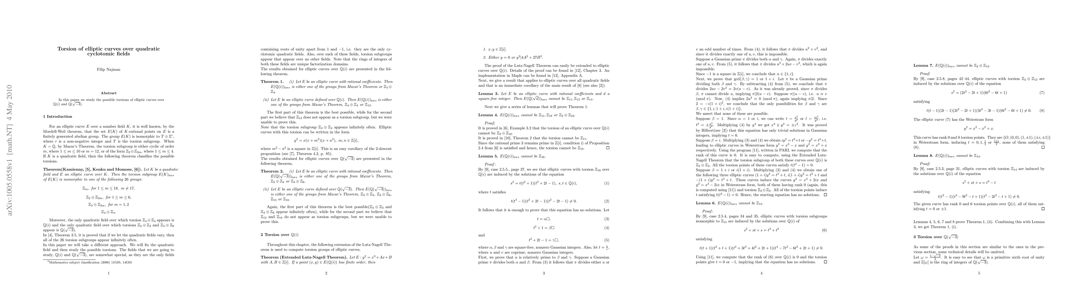 This paper investigates the possible torsions of elliptic curves over two quadratic cyclotomic fields: $inom{ ext{Elliptic curves with finite torsion}}{ ext{Over } inom{Q(i) ext{ and }}inom{ ext{ Q( ext{-}3)}}{ ext{.}}}$
