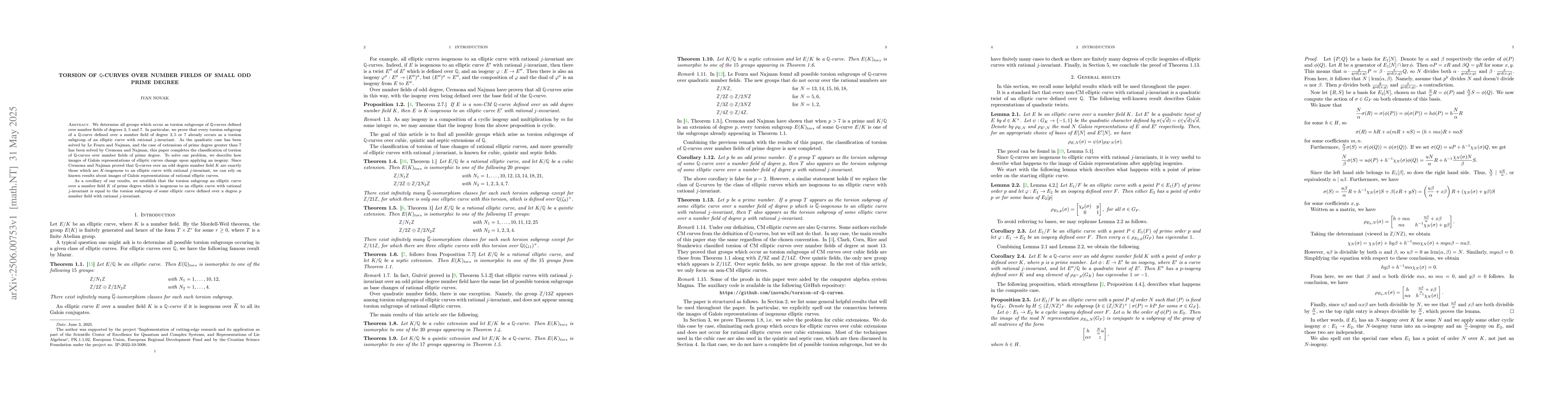 We determine all groups which occur as torsion subgroups of $\mathbb Q$-curves defined over number fields of degrees $3$, $5$ and $7$. In particular, we prove that every torsion subgroup of a $\mathbb Q$-curve defined over a number field of degree $3,5$ or $7$ already occurs as a torsion subgroup of an elliptic curve with rational $j$-invariant. As the quadratic case has been solved by Le Fourn and Najman, and the case of extensions of prime degree greater than $7$ has been solved by Cremona and Najman, this paper completes the classification of torsion of $\mathbb Q$-curves over number fields of prime degree. We also establish that the torsion subgroup an elliptic curve over a number field $K$ of prime degree which is isogenous to an elliptic curve with rational $j$-invariant is equal to the torsion subgroup of some elliptic curve defined over a degree $p$ number field with rational $j$-invariant.