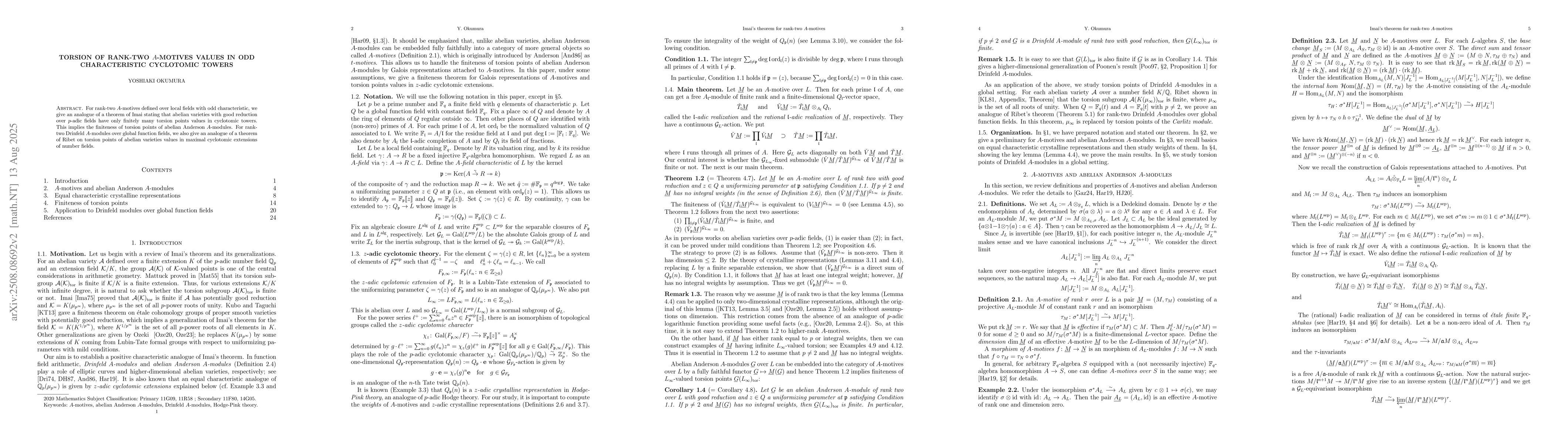 For rank-two $A$-motives defined over local fields with odd characteristic, we give an analogue of a theorem of Imai stating that abelian varieties with good reduction over $p$-adic fields have only finitely many torsion points values in cyclotomic towers. This implies the finiteness of torsion points of abelian Anderson $A$-modules. For rank-two Drinfeld $A$-modules over global function fields, we also give an analogue of a theorem of Ribet on torsion points of abelian varieties values in maximal cyclotomic extensions of number fields.