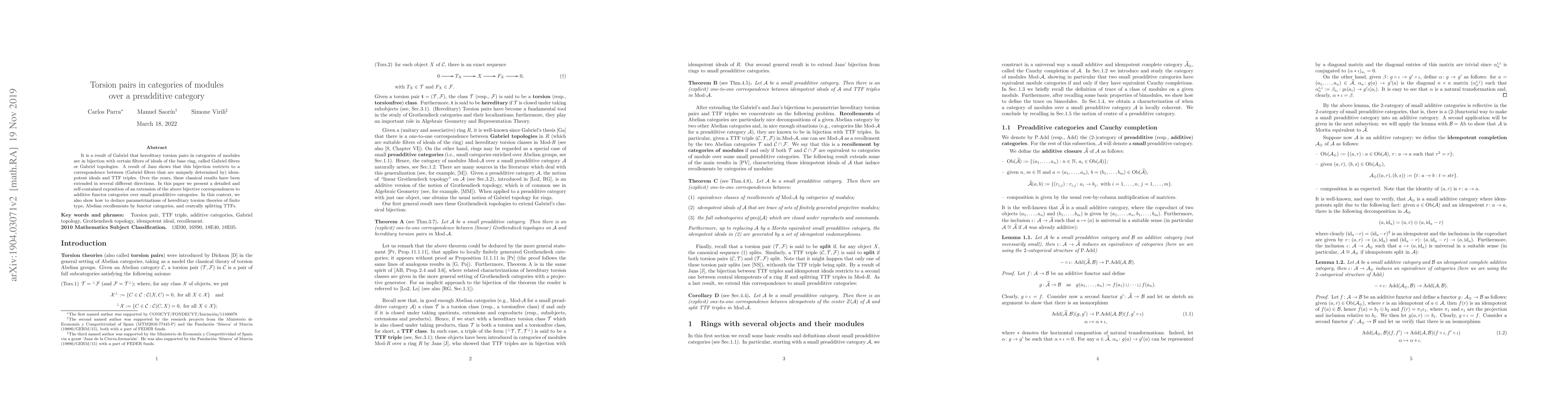 It is a result of Gabriel that hereditary torsion pairs in categories of modules are in bijection with certain filters of ideals of the base ring, called Gabriel filters or Gabriel topologies. A result of Jans shows that this bijection restricts to a correspondence between (Gabriel filters that are uniquely determined by) idempotent ideals and TTF triples. Over the years, these classical results have been extended in several different directions. In this paper we present a detailed and self-contained exposition of an extension of the above bijective correspondences to additive functor categories over small preadditive categories. In this context, we also show how to deduce parametrizations of hereditary torsion theories of finite type, Abelian recollements by functor categories, and centrally splitting TTFs.