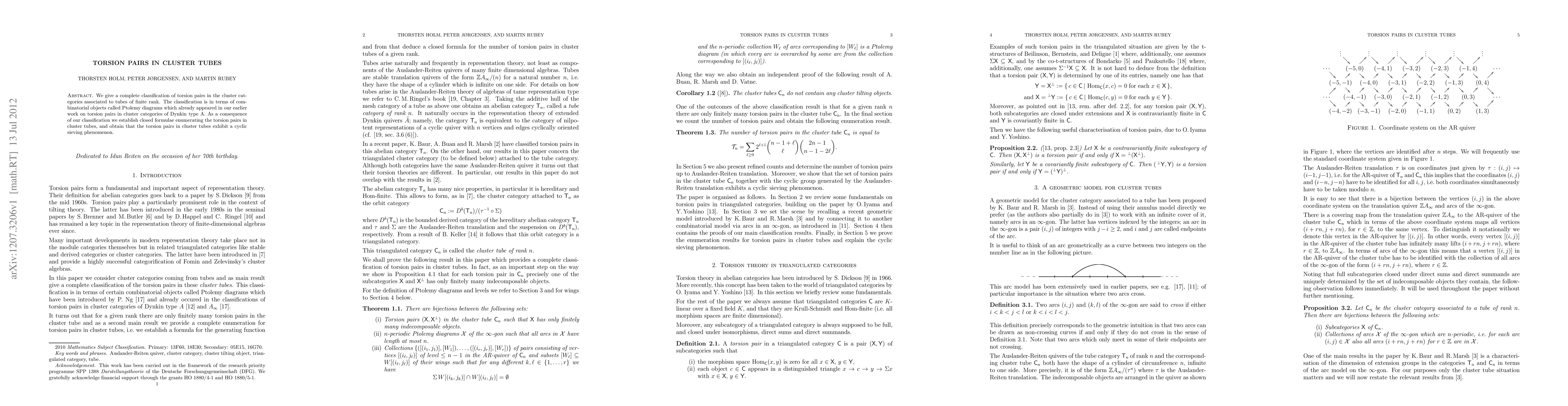 The paper provides a comprehensive classification of torsion pairs in cluster categories linked to tubes of finite rank, employing Ptolemy diagrams. It establishes closed formulae for counting these torsion pairs and reveals a cyclic sieving phenomenon within them.