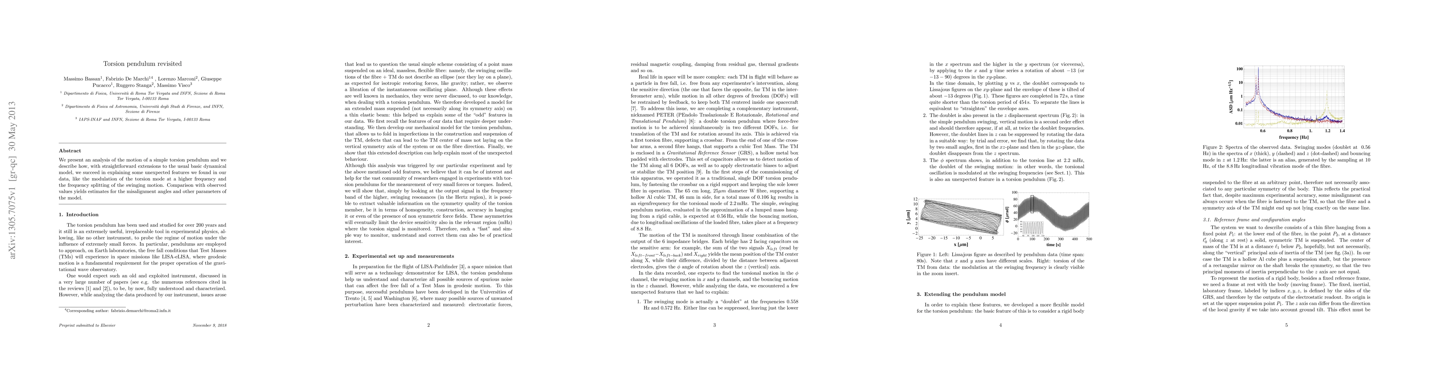 This paper analyzes the motion of a torsion pendulum, extending the basic dynamical model to explain unexpected features such as higher frequency modulation and frequency splitting. It provides estimates for misalignment angles and other parameters through comparison with observed data.