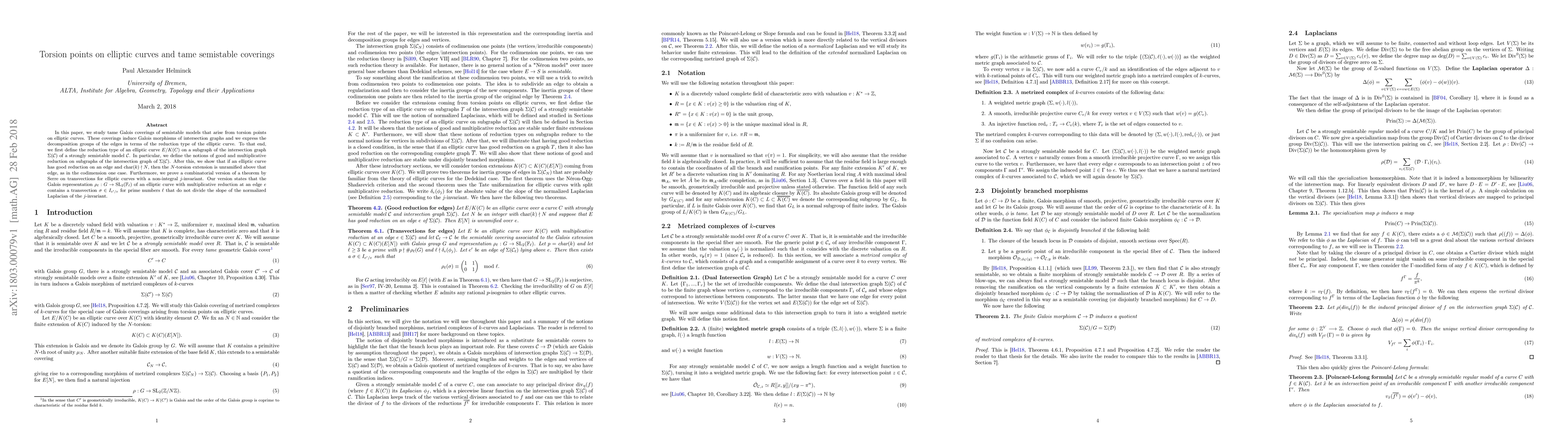 In this paper, we study tame Galois coverings of semistable models that arise from torsion points on elliptic curves. These coverings induce Galois morphisms of intersection graphs and we express the decomposition groups of the edges in terms of the reduction type of the elliptic curve. To that end, we first define the reduction type of an elliptic curve $E/K(C)$ on a subgraph of the intersection graph $\Sigma(\mathcal{C})$ of a strongly semistable model $\mathcal{C}$. In particular, we define the notions of good and multiplicative reduction on subgraphs of the intersection graph of $\Sigma(\mathcal{C})$. After this, we show that if an elliptic curve has good reduction on an edge and $\mathrm{char}(k)\nmid{N}$, then the $N$-torsion extension is unramified above that edge, as in the codimension one case. Furthermore, we prove a combinatorial version of a theorem by Serre on transvections for elliptic curves with a non-integral $j$-invariant. Our version states that the Galois representation $\rho_{\ell}:G\rightarrow{\mathrm{SL}_{2}(\mathbb{F}_{\ell})}$ of an elliptic curve with multiplicative reduction at an edge $e$ contains a transvection $\sigma\in{I_{e'/e}}$ for prime numbers $\ell$ that do not divide the slope of the normalized Laplacian of the $j$-invariant.