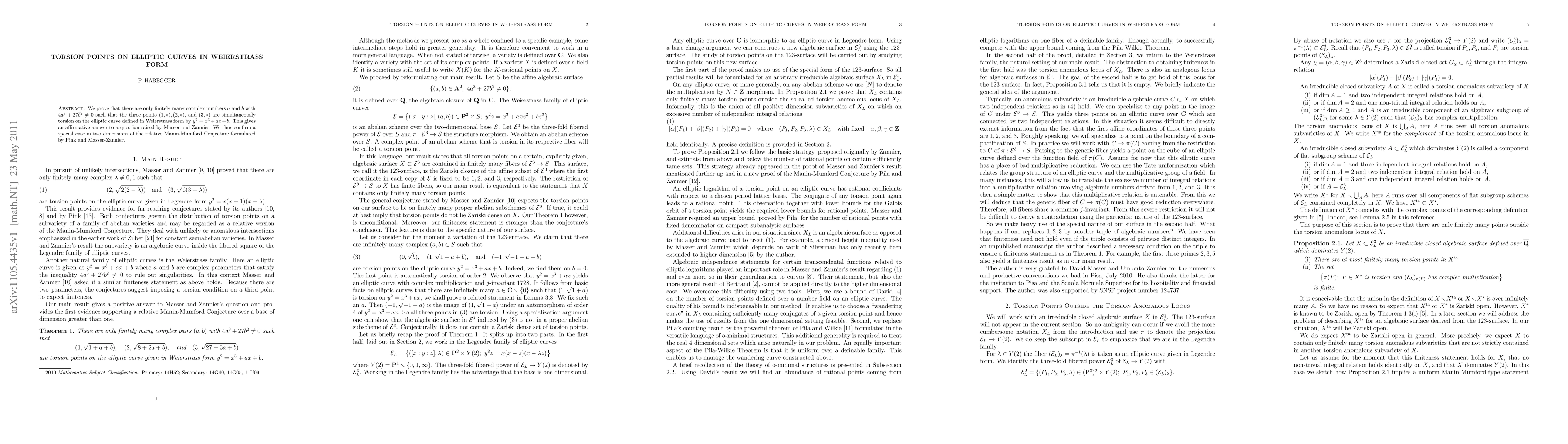 We prove that there are only finitely many complex numbers $a$ and $b$ with $4a^3+27b^2\not=0$ such that the three points $(1,*),(2,*),$ and $(3,*)$ are simultaneously torsion on the elliptic curve defined in Weierstrass form by $y^2=x^3+ax+b$. This gives an affirmative answer to a question raised by Masser and Zannier. We thus confirm a special case in two dimensions of the relative Manin-Mumford Conjecture formulated by Pink and Masser-Zannier.