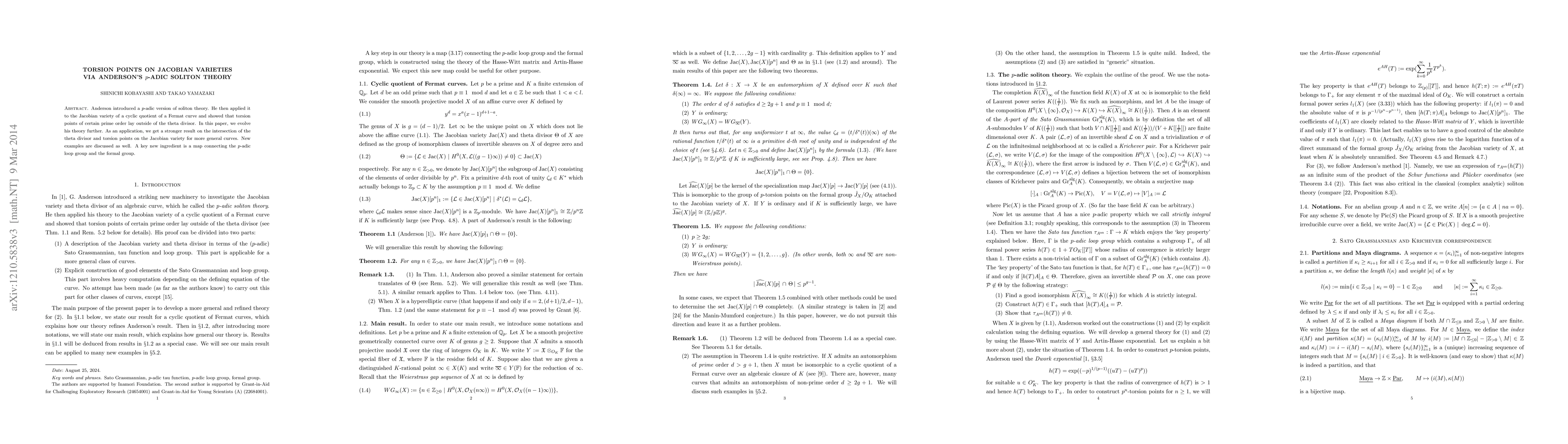 Anderson introduced a $p$-adic version of soliton theory. He then applied it to the Jacobian variety of a cyclic quotient of a Fermat curve and showed that torsion points of certain prime order lay outside of the theta divisor. In this paper, we evolve his theory further. As an application, we get a stronger result on the intersection of the theta divisor and torsion points on the Jacobian variety for more general curves. New examples are discussed as well. A key new ingredient is a map connecting the $p$-adic loop group and the formal group.