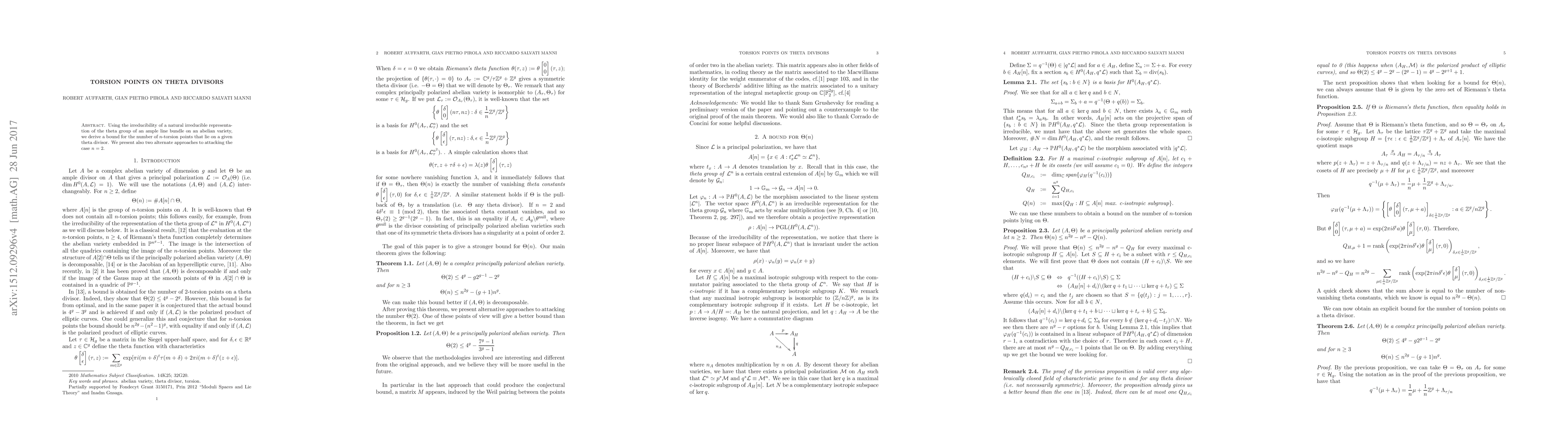 Summary: The paper establishes a bound for $n$-torsion points on theta divisors via an irreducible representation of the theta group, and explores alternative methods specifically for $n=2$. The irreducubility ensures a comprehensive analysis of torsion points in the context of abelian varieties.
