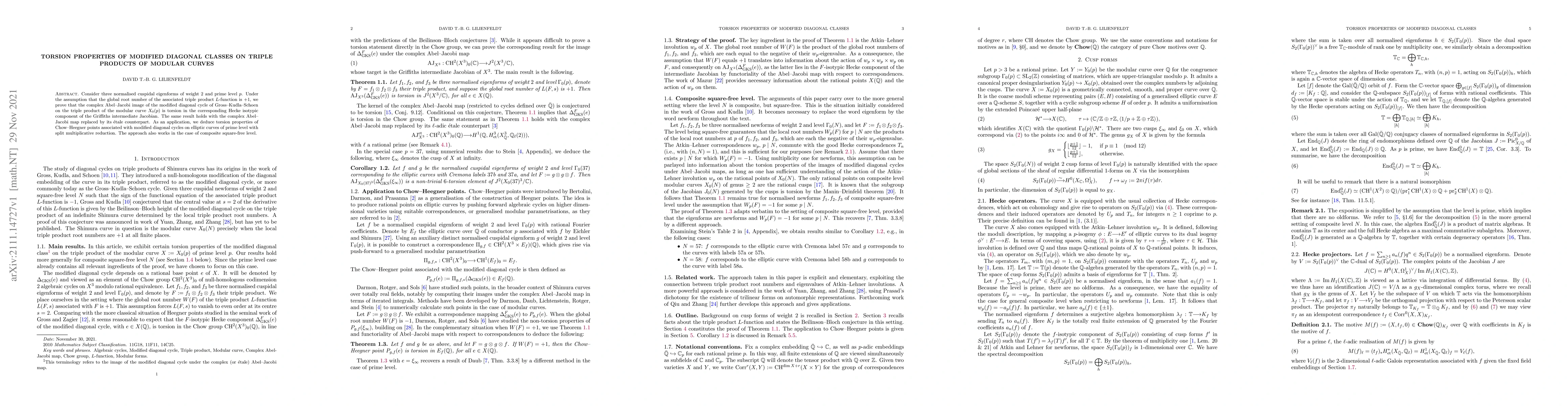 This paper proves that the complex Abel-Jacobi image of modified diagonal cycles on triple products of modular curves is torsion, under the condition that the global root number is $+1$. This result extends to \'etale counterparts and has implications for torsion properties of Chow-Heegner points on elliptic curves of prime level.