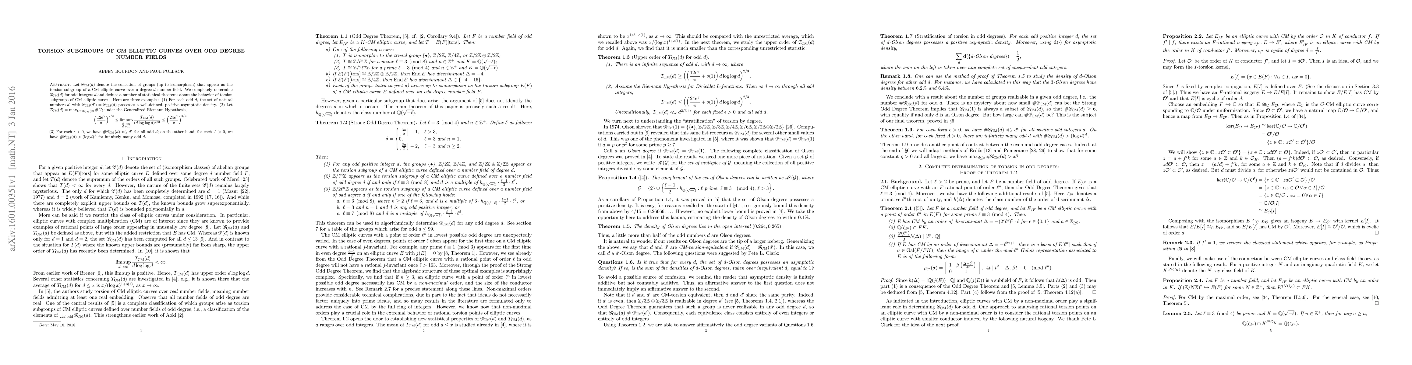 Let $\mathscr{G}_{\rm CM}(d)$ denote the collection of groups (up to isomorphism) that appear as the torsion subgroup of a CM elliptic curve over a degree $d$ number field. We completely determine $\mathscr{G}_{\rm CM}(d)$ for odd integers $d$ and deduce a number of statistical theorems about the behavior of torsion subgroups of CM elliptic curves. Here are three examples: (1) For each odd $d$, the set of natural numbers $d'$ with $\mathscr{G}_{\rm CM}(d') = \mathscr{G}_{\rm CM}(d)$ possesses a well-defined, positive asymptotic density. (2) Let $T_{\rm CM}(d) = \max_{G \in \mathscr{G}_{\rm CM}(d)} \#G$; under the Generalized Riemann Hypothesis, $$\left(\frac{12e^{\gamma}}{\pi}\right)^{2/3} \le \limsup_{\substack{d\to\infty\\d\text{ odd}}} \frac{T_{\rm CM}(d)}{(d\log\log{d})^{2/3}} \le \left(\frac{24e^{\gamma}}{\pi}\right)^{2/3}.$$ (3) For each $\epsilon > 0$, we have $\#\mathscr{G}_{\rm CM}(d) \ll_{\epsilon} d^{\epsilon}$ for all odd $d$; on the other hand, for each $A> 0$, we have $\#\mathscr{G}_{\rm CM}(d) > (\log{d})^A$ for infinitely many odd $d$.