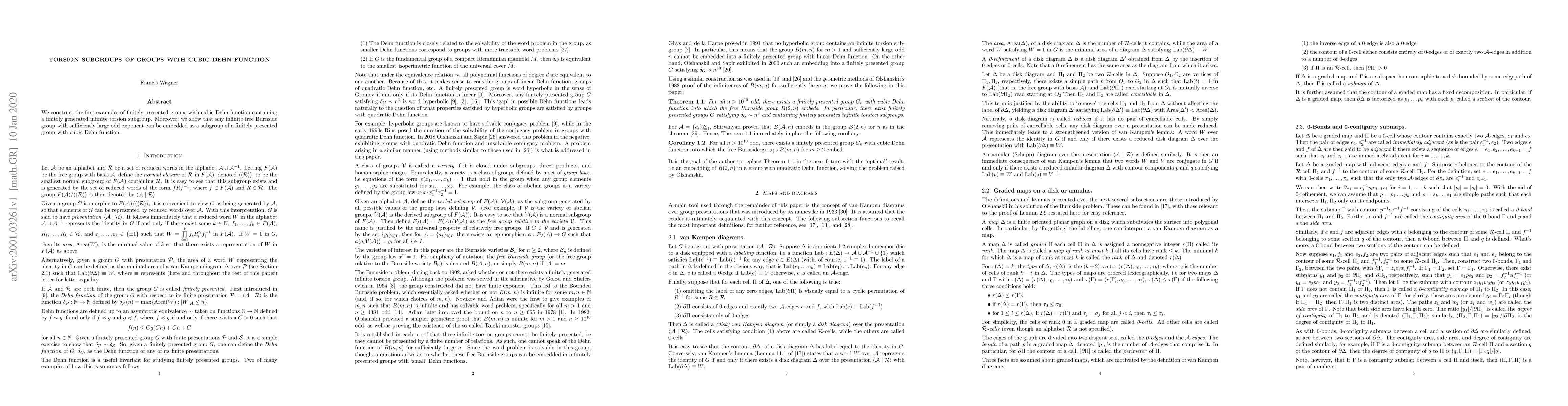 This paper constructs the first examples of finitely presented groups with a cubic Dehn function that contain a finitely generated infinite torsion subgroup. It also demonstrates that any infinite free Burnside group with a sufficiently large odd exponent can be embedded in such a finitely presented group.