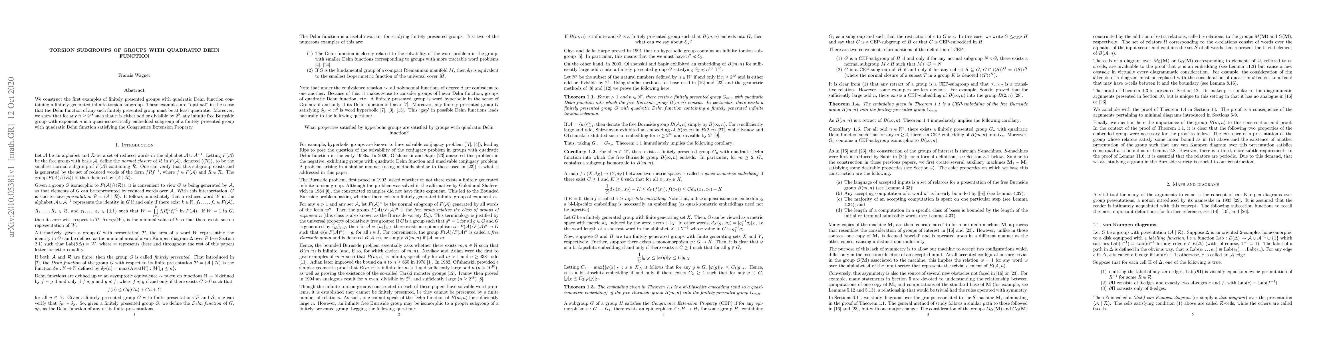 This paper presents the first examples of finitely presented groups with a quadratic Dehn function that contain a finitely generated infinite torsion subgroup. It also demonstrates that any infinite free Burnside group with sufficiently large exponent embeds quasi-isometrically into such groups, satisfying the Congruence Extension Property.