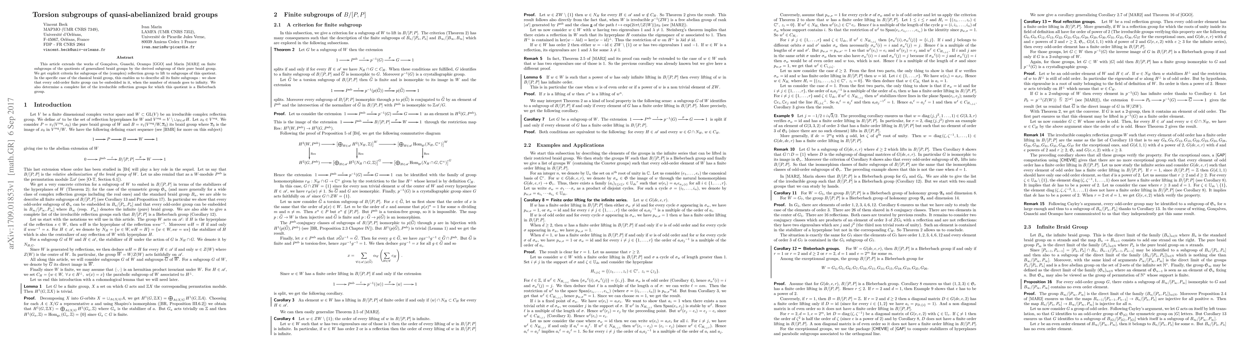 This paper investigates torsion subgroups in quasi-abelianized braid groups, providing criteria for subgroups of complex reflection groups to lift to these quotients. It reveals that every odd-order finite group can be embedded in the classical braid group with an infinite number of strands, and identifies which irreducible reflection groups yield Bieberbach groups in this context.