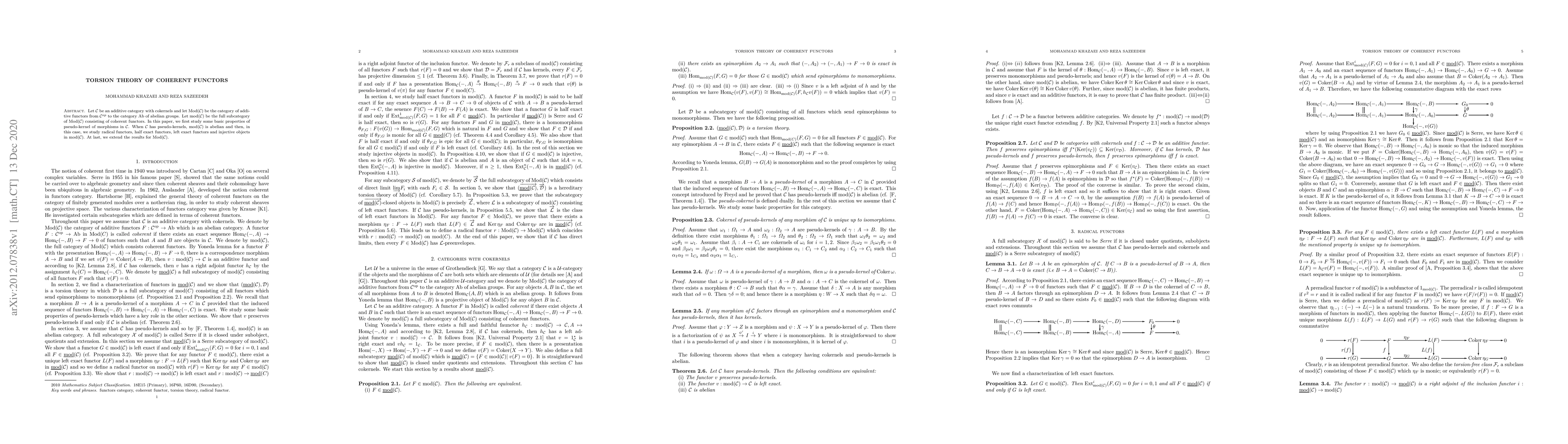 This paper explores the torsion theory of coherent functors in additive categories with cokernels. It examines pseudo-kernels, establishes the abelian nature of the category of coherent functors when pseudo-kernels exist, and investigates radical, half exact, left exact functors, and injective objects within this framework, extending these findings to the broader category of additive functors.