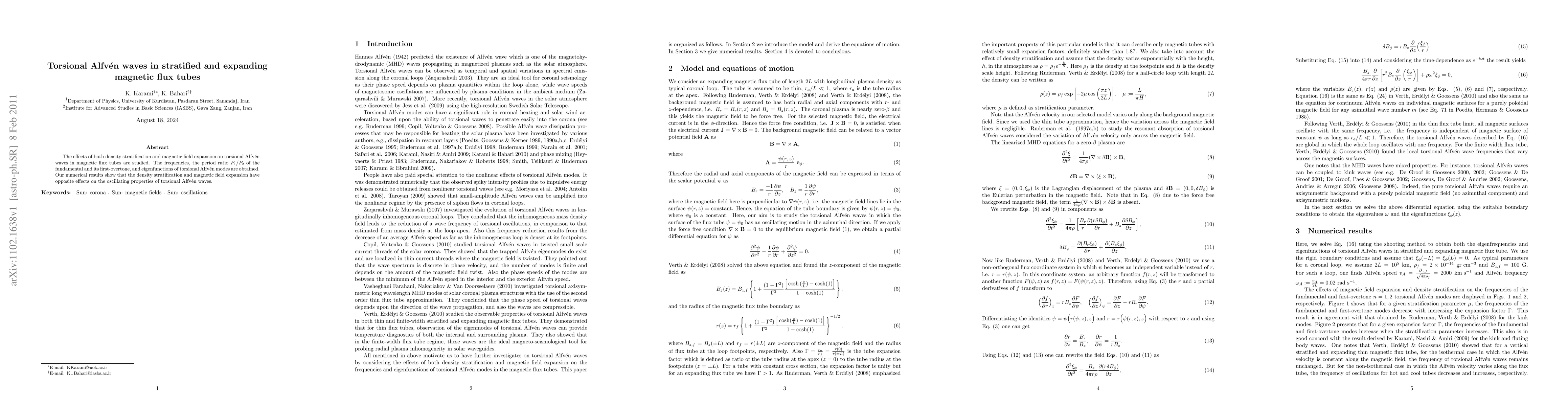 This paper investigates how density stratification and magnetic field expansion influence torsional Alfven waves in magnetic flux tubes, finding that these factors have opposing effects on the wave's frequencies and eigenfunctions. Numerical results reveal specific changes in the fundamental and first-overtone period ratios.