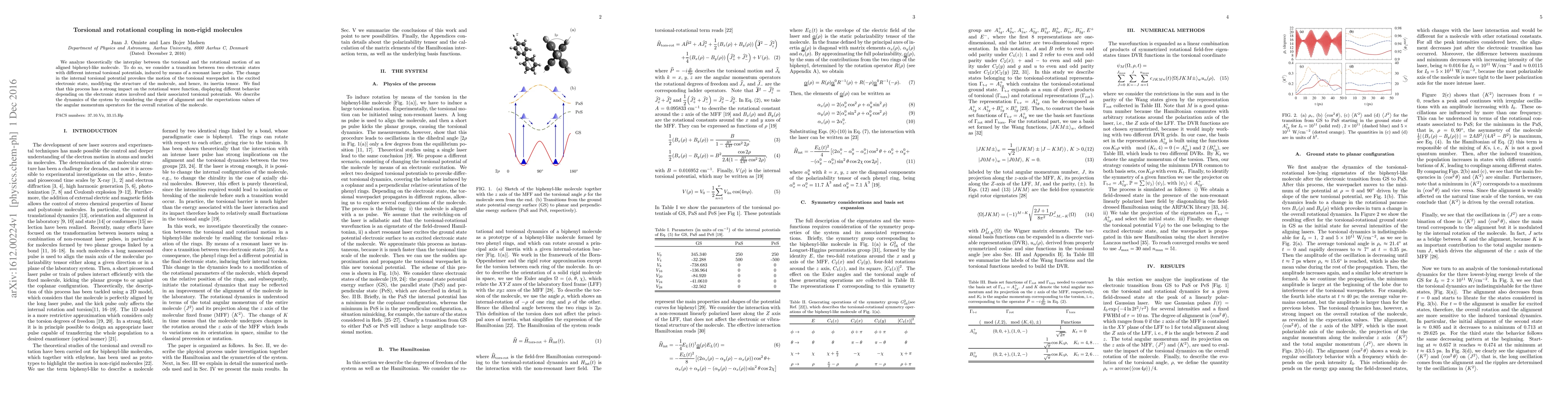 We analyze theoretically the interplay between the torsional and the rotational motion of an aligned biphenyl-like molecule. To do so, we consider a transition between two electronic states with different internal torsional potentials, induced by means of a resonant laser pulse. The change in the internal torsional potential provokes the motion of the torsional wavepacket in the excited electronic state, modifying the structure of the molecule, and hence, its inertia tensor. We find that this process has a strong impact on the rotational wave function, displaying different behavior depending on the electronic states involved and their associated torsional potentials. We describe the dynamics of the system by considering the degree of alignment and the expectations values of the angular momentum operators for the overall rotation of the molecule.