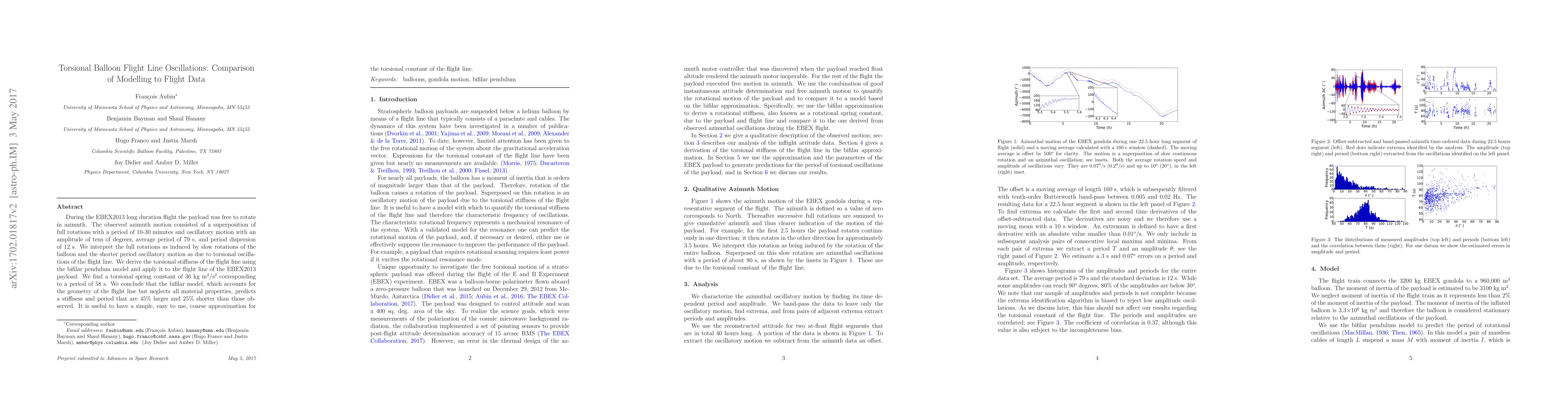 During the EBEX2013 long duration flight the payload was free to rotate in azimuth. The observed azimuth motion consisted of a superposition of full rotations with a period of 10-30 minutes and oscillatory motion with an amplitude of tens of degrees, average period of 79 s, and period dispersion of 12 s. We interpret the full rotations as induced by slow rotations of the balloon and the shorter period oscillatory motion as due to torsional oscillations of the flight line. We derive the torsional stiffness of the flight line using the bifilar pendulum model and apply it to the flight line of the EBEX2013 payload. We find a torsional spring constant of 36 kg m$^2$/s$^2$ corresponding to a period of 58 s. We conclude that the bifilar model, which accounts for the geometry of the flight line but neglects all material properties, predicts a stiffness and period that are 45% larger and 25% shorter than those observed. It is useful to have a simple, easy to use, coarse approximation for the torsional constant of the flight line.