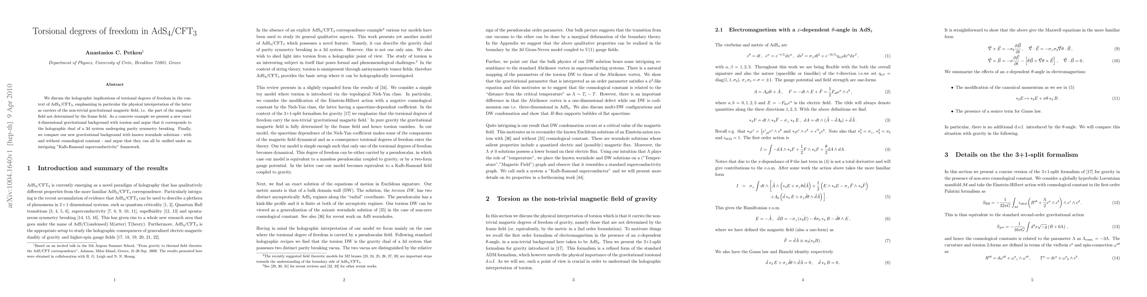 This paper explores the holographic implications of torsional degrees of freedom in AdS4/CFT3, interpreting them as carriers of a non-trivial gravitational magnetic field. It presents a new exact 4d gravitational background with torsion, arguing it corresponds to a 3d system with parity symmetry breaking, and unifies various gravitational backgrounds under a "Kalb-Ramond superconductivity" framework.