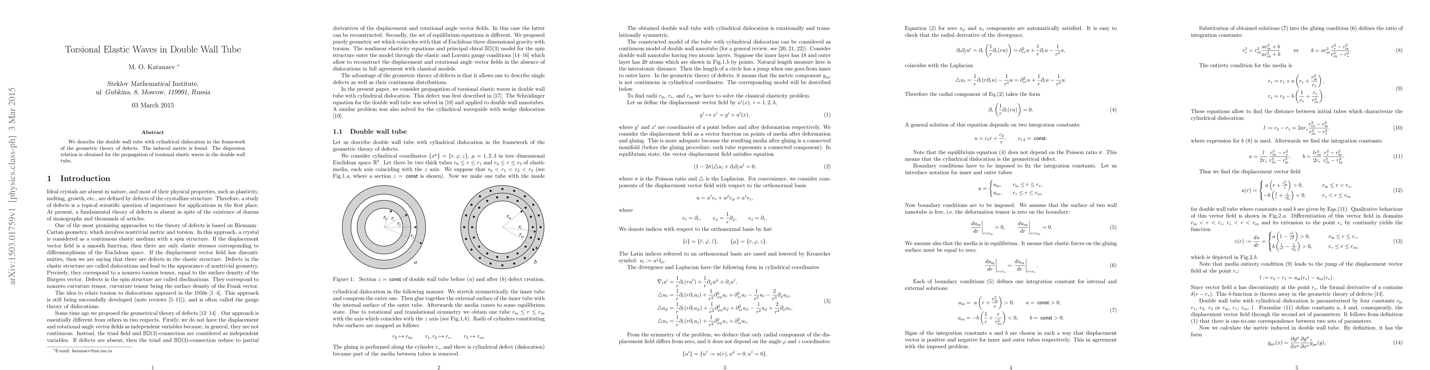 This paper explores torsional elastic waves in a double wall tube using the geometric theory of defects, revealing new insights into wave propagation.