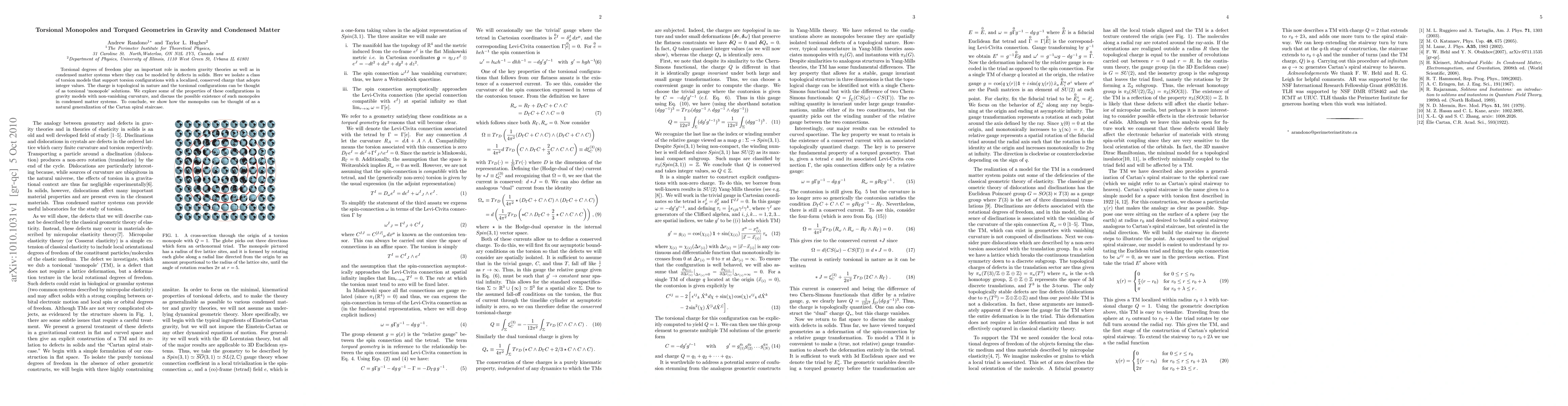 This paper investigates torsional monopoles—localized, conserved torsional charges in gravity and condensed matter systems—and explores their topological properties and potential existence in both theoretical gravity models and real-world materials. It concludes by linking these torsional configurations to a generalized Cartan spiral staircase.