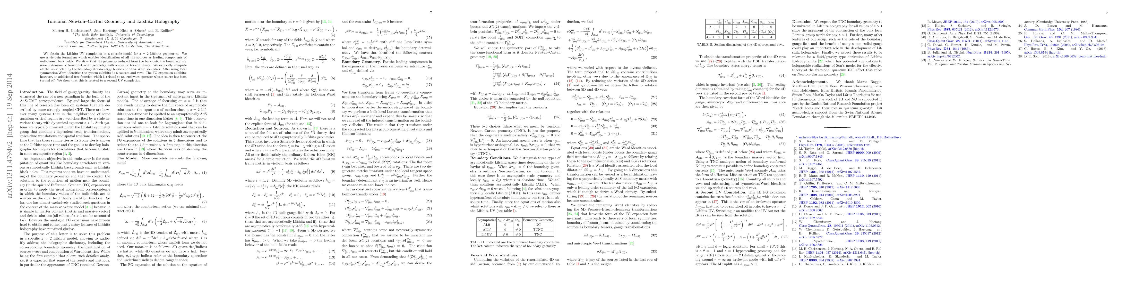 This paper presents a novel torsional Newton-Cartan geometry for a z=2 Lifshitz UV completion using a vielbein formalism, identifying all sources as leading components of bulk fields. It computes vevs and Ward identities, revealing an additional free function related to an irrelevant operator, suggesting a second UV completion.