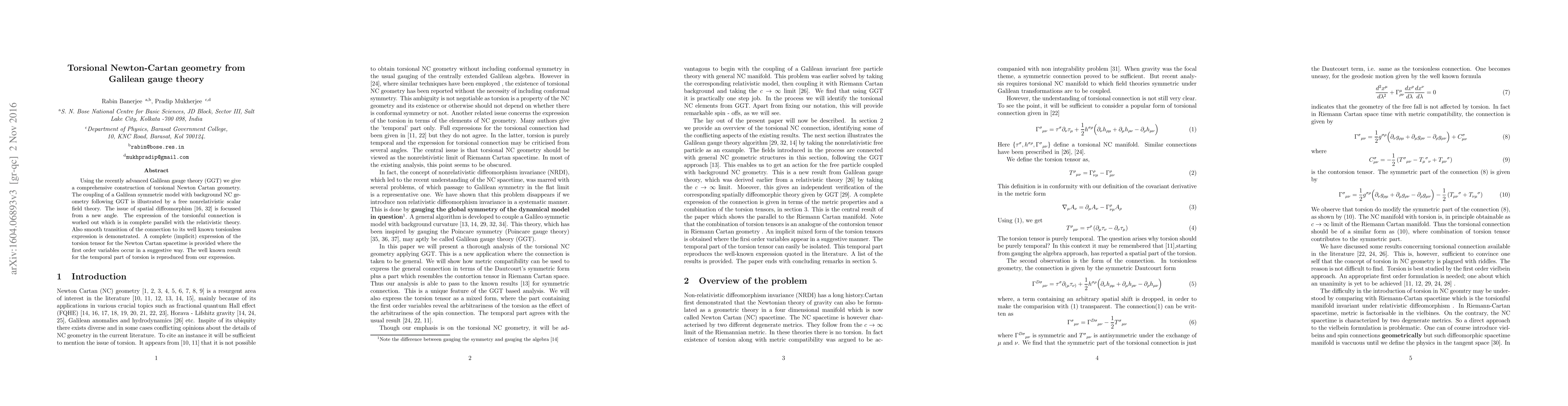 Using the recently advanced Galilean gauge theory (GGT) we give a comprehensive construction of torsional Newton Cartan geometry. The coupling of a Galilean symmetric model with background NC geometry following GGT is illustrated by a free nonrelativistic scalar field theory. The issue of spatial diffeomorphisn \cite{SW, BMM3} is focussed from a new angle. The expression of the torsionful connection is worked out which is in complete parallel with the relativistic theory. Also smooth transition of the connection to its well known torsionless expression is demonstrated. A complete (implicit) expression of the torsion tensor for the Newton Cartan spacetime is provided where the first order variables occur in a suggestive way. The well known result for the temporal part of torsion is reproduced from our expression.