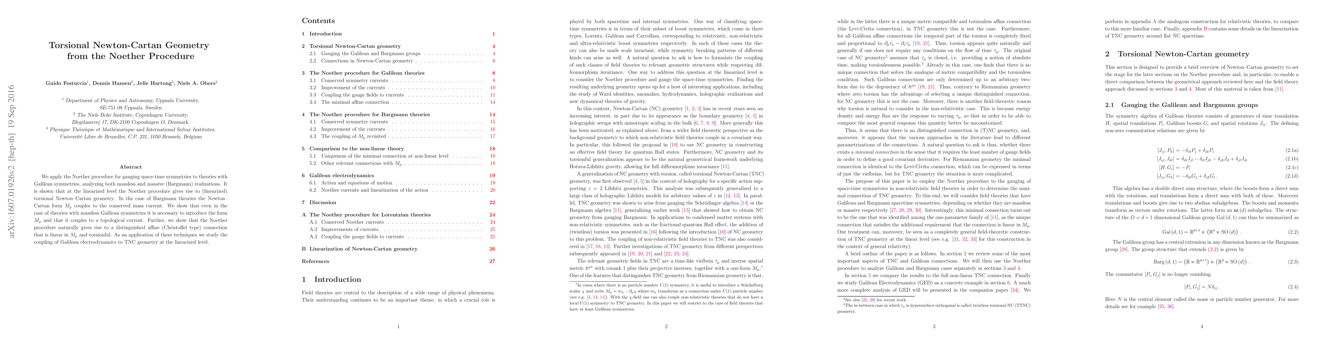 We apply the Noether procedure for gauging space-time symmetries to theories with Galilean symmetries, analyzing both massless and massive (Bargmann) realizations. It is shown that at the linearized level the Noether procedure gives rise to (linearized) torsional Newton-Cartan geometry. In the case of Bargmann theories the Newton-Cartan form $M_\mu$ couples to the conserved mass current. We show that even in the case of theories with massless Galilean symmetries it is necessary to introduce the form $M_\mu$ and that it couples to a topological current. Further, we show that the Noether procedure naturally gives rise to a distinguished affine (Christoffel type) connection that is linear in $M_\mu$ and torsionful. As an application of these techniques we study the coupling of Galilean electrodynamics to TNC geometry at the linearized level.