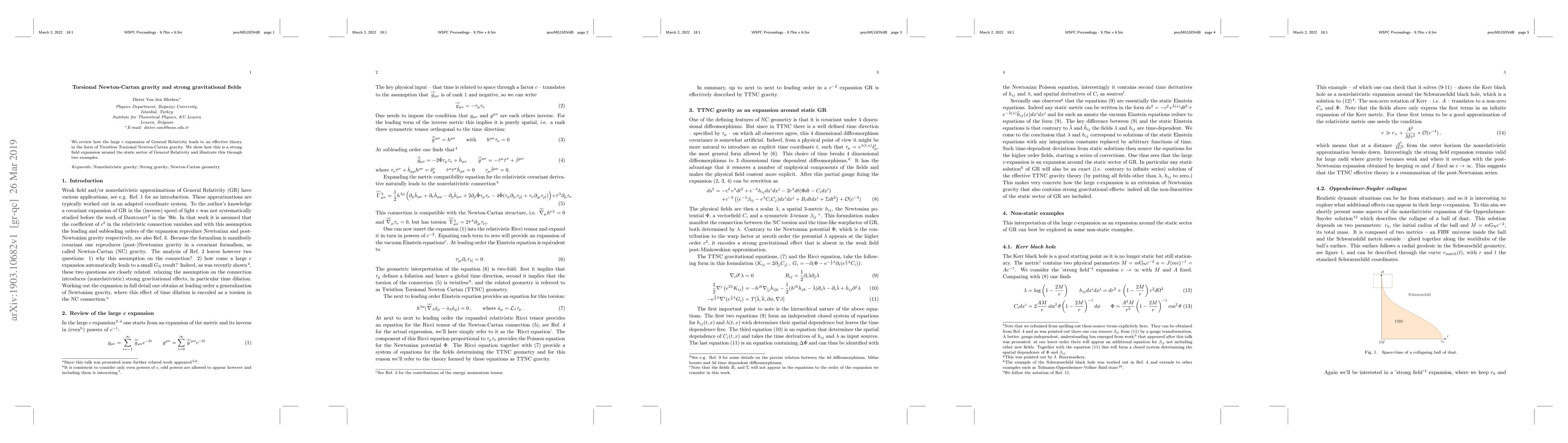 We review how the large $c$ expansion of General Relativity leads to an effective theory in the form of Twistless Torsional Newton-Cartan gravity. We show how this is a strong field expansion around the static sector of General Relativity and illustrate this through two examples.