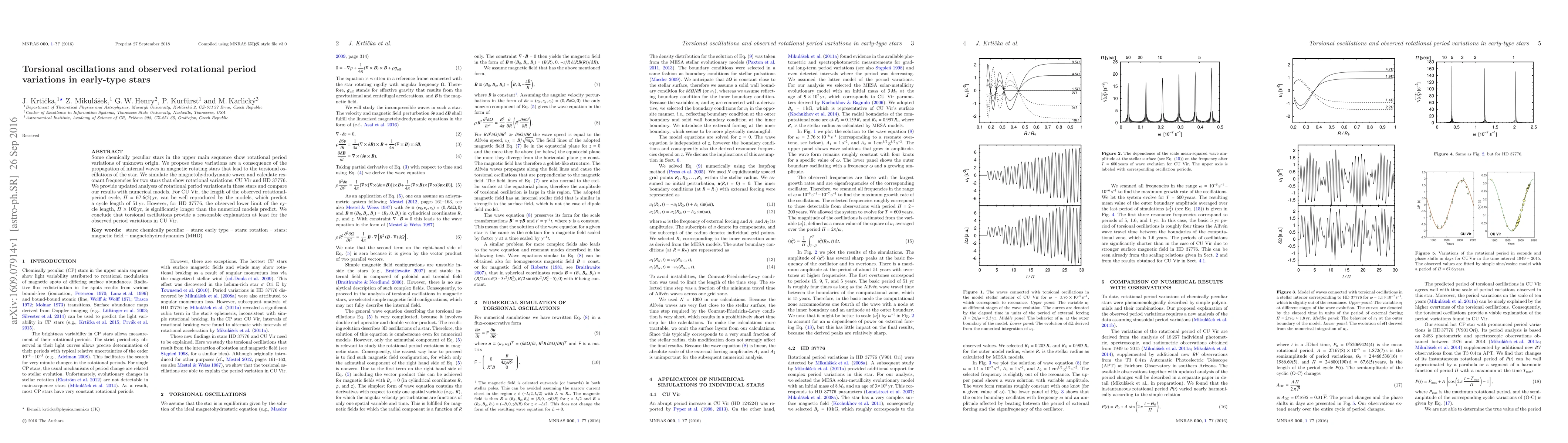 Some chemically peculiar stars in the upper main sequence show rotational period variations of unknown origin. We propose these variations are a consequence of the propagation of internal waves in magnetic rotating stars that lead to the torsional oscillations of the star. We simulate the magnetohydrodynamic waves and calculate resonant frequencies for two stars that show rotational variations: CU Vir and HD 37776. We provide updated analyses of rotational period variations in these stars and compare our results with numerical models. For CU Vir, the length of the observed rotational-period cycle, $\mathit\Pi=67.6(5)$ yr, can be well reproduced by the models, which predict a cycle length of 51 yr. However, for HD 37776, the observed lower limit of the cycle length, $\mathit\Pi\geq100$ yr, is significantly longer than the numerical models predict. We conclude that torsional oscillations provide a reasonable explanation at least for the observed period variations in CU Vir.