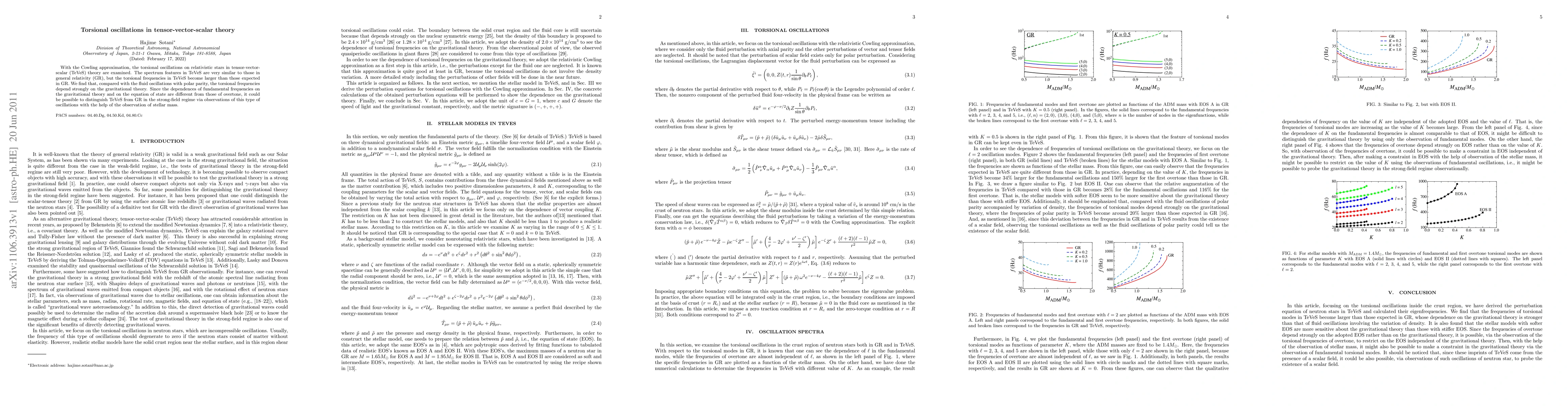 This paper examines torsional oscillations in relativistic stars under the tensor-vector-scalar (TeVeS) theory using the Cowling approximation, revealing that TeVeS torsional frequencies are higher than those in general relativity (GR). The study suggests that these oscillations could help distinguish TeVeS from GR in strong-field regimes through observations of stellar mass.