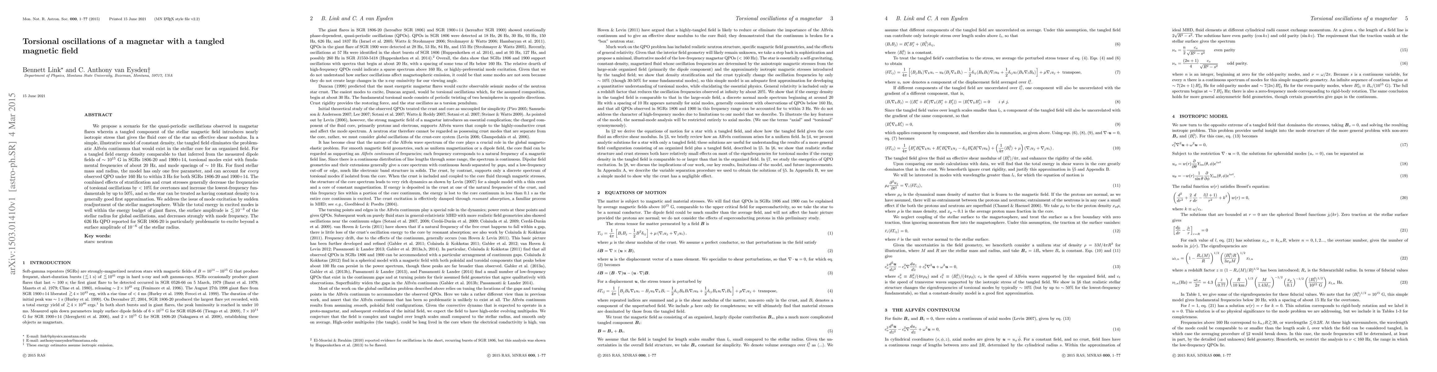 This paper proposes a model explaining quasi-periodic oscillations in magnetar flares through torsional oscillations driven by a tangled magnetic field, which provides an effective shear modulus to the core. The model predicts torsional modes with frequencies up to 20 Hz and can account for observed quasi-periodic oscillations up to 160 Hz.