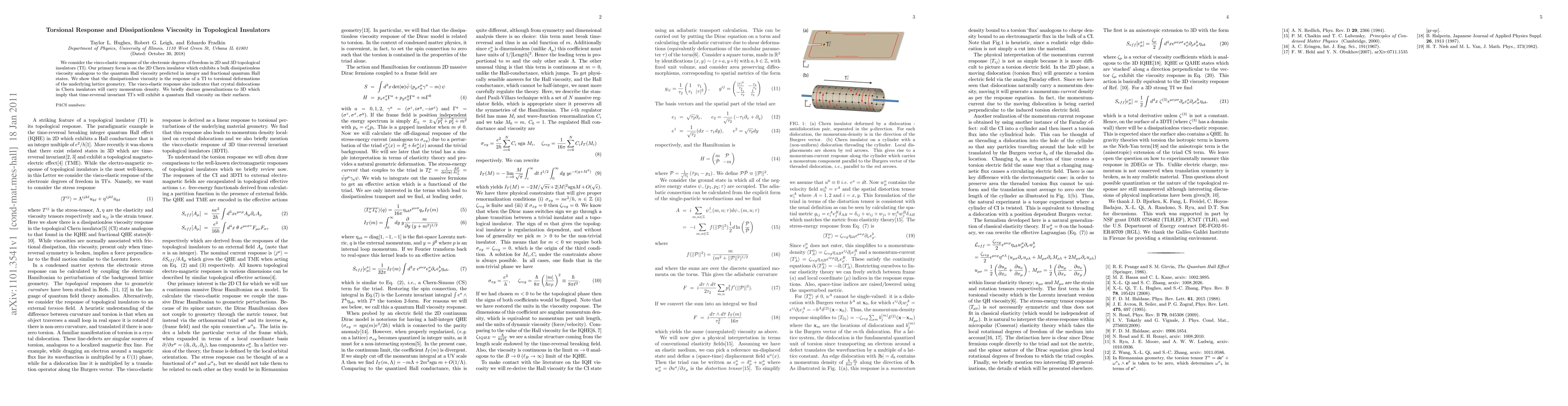 This paper investigates the visco-elastic response of topological insulators, specifically the 2D Chern insulator, revealing a bulk dissipationless viscosity akin to quantum Hall viscosity in response to torsional deformations. It also suggests that dislocations in Chern insulators carry momentum density, with implications extending to 3D topological insulators displaying quantum Hall viscosity on their surfaces.