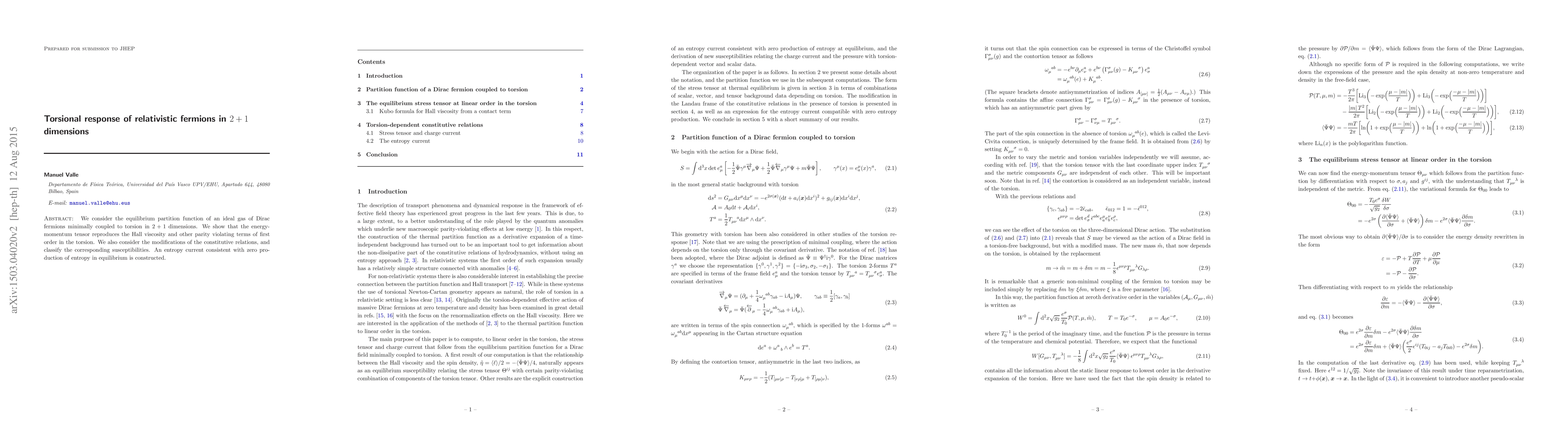 This study investigates the behavior of relativistic fermions in 2+1 dimensions when coupled to torsion, finding that it reproduces Hall viscosity and other parity-violating terms, and modifies constitutive relations while producing an entropy current consistent with equilibrium.