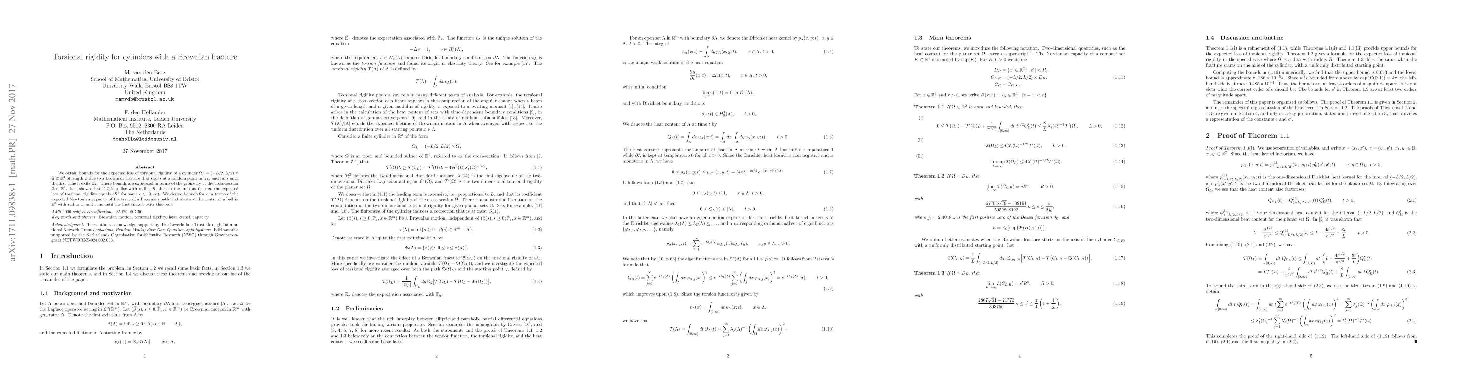 This paper provides bounds for the expected loss of torsional rigidity in a long cylinder due to a Brownian fracture, showing that for a cylindrical cross-section shaped as a disc, the loss approaches a constant multiple of the radius to the fifth power as the cylinder length increases. The constant is derived from the expected Newtonian capacity of a Brownian path in a three-dimensional ball.
