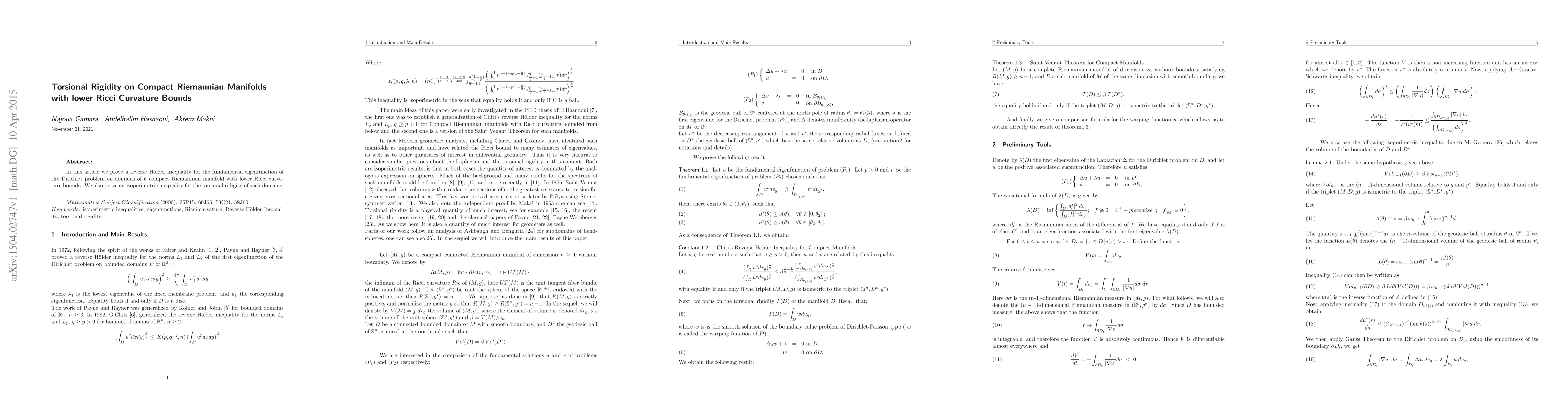In this article we prove a reverse H\"older inequality for the fundamental eigenfunction of the Dirichlet problem on domains of a compact Riemannian manifold with lower Ricci curvature bounds. We also prove an isoperimetric inequality for the torsional ridigity of such domains.