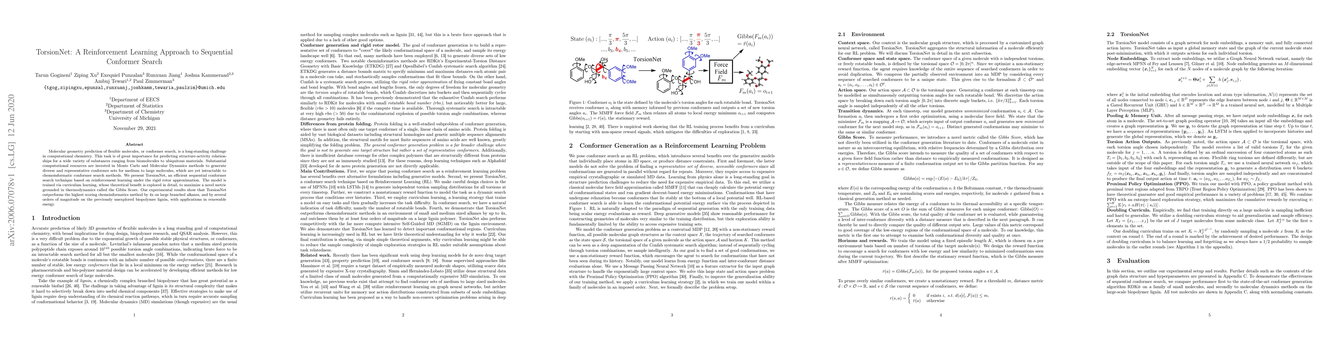 Molecular geometry prediction of flexible molecules, or conformer search, is a long-standing challenge in computational chemistry. This task is of great importance for predicting structure-activity relationships for a wide variety of substances ranging from biomolecules to ubiquitous materials. Substantial computational resources are invested in Monte Carlo and Molecular Dynamics methods to generate diverse and representative conformer sets for medium to large molecules, which are yet intractable to chemoinformatic conformer search methods. We present TorsionNet, an efficient sequential conformer search technique based on reinforcement learning under the rigid rotor approximation. The model is trained via curriculum learning, whose theoretical benefit is explored in detail, to maximize a novel metric grounded in thermodynamics called the Gibbs Score. Our experimental results show that TorsionNet outperforms the highest scoring chemoinformatics method by 4x on large branched alkanes, and by several orders of magnitude on the previously unexplored biopolymer lignin, with applications in renewable energy.