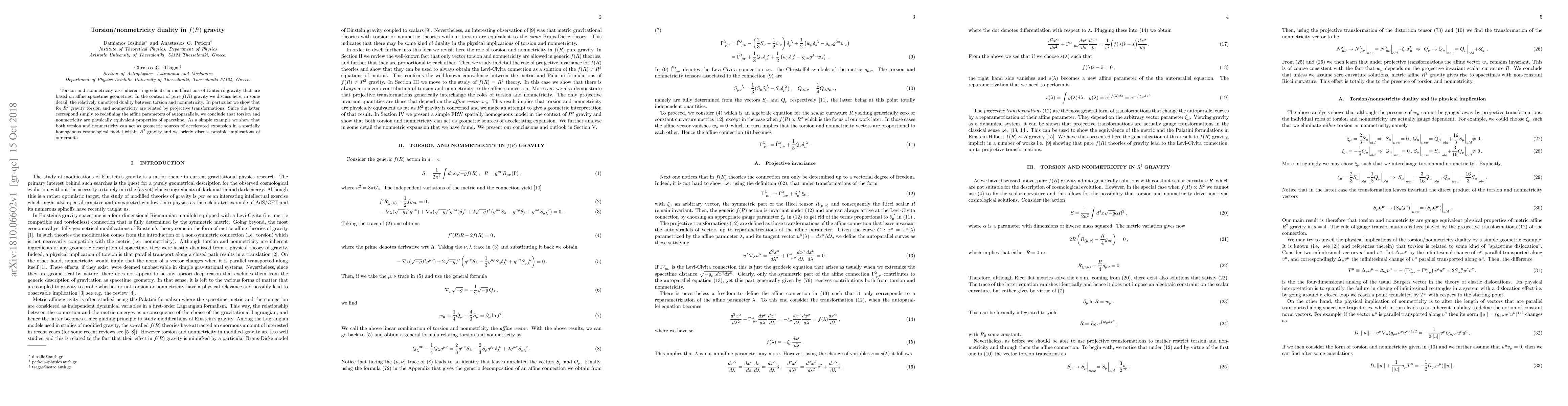 The paper explores the duality between torsion and non-metricity in f(R) gravity, specifically focusing on R^2 gravity. It uses projective transformations to demonstrate the equivalence of torsion and non-metricity as physical properties of affine spacetime geometries.