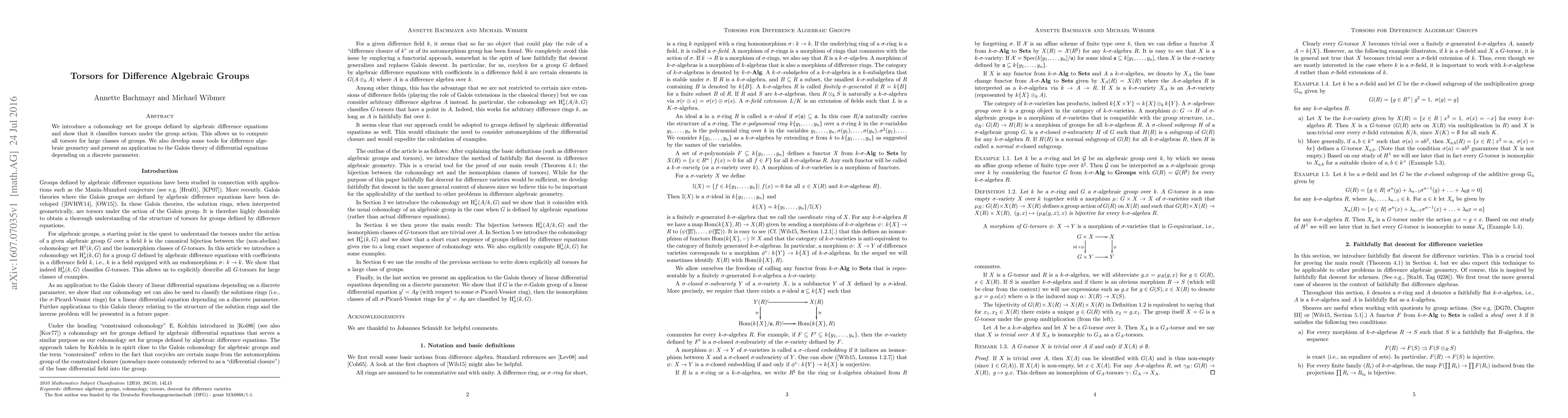 We introduce a cohomology set for groups defined by algebraic difference equations and show that it classifies torsors under the group action. This allows us to compute all torsors for large classes of groups. We also develop some tools for difference algebraic geometry and present an application to the Galois theory of differential equations depending on a discrete parameter.