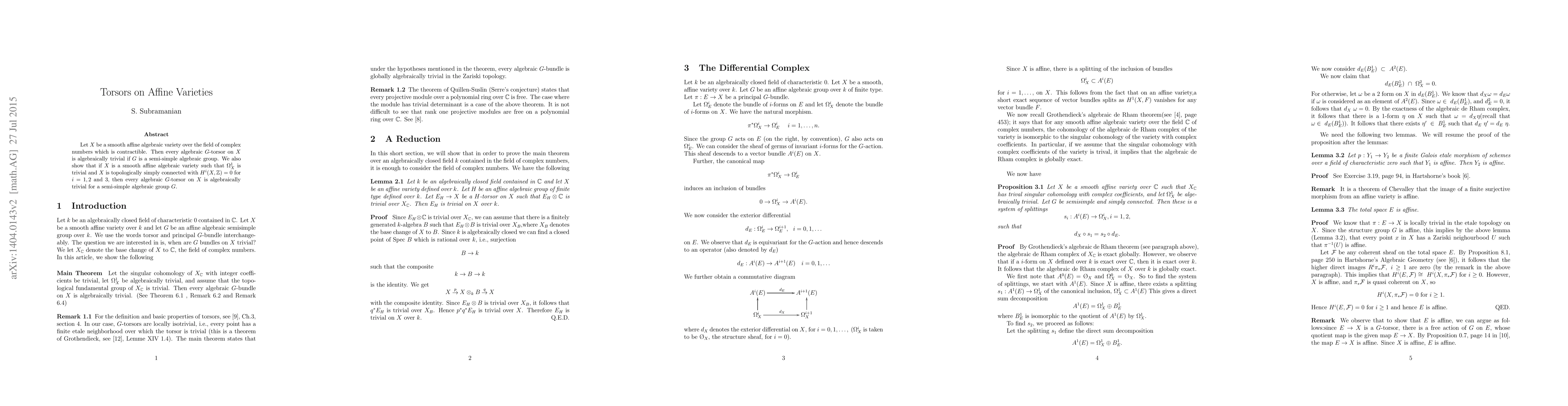 Let $X$ be a smooth affine algebraic variety over the field of complex numbers which is contractible. Then every algebraic $G$-torsor on $X$ is algebraically trivial if $G$ is a semi-simple algebraic group. We also show that if $X$ is a smooth affine algebraic variety such that $\Omega^1_X$ is trivial and $X$ is topologically simply connected with $H^i(X,{\mathbb Z})=0$ for $i=1,2$ and $3$, then every algebraic $G$-torsor on $X$ is algebraically trivial for a semi-simple algebraic group $G$.