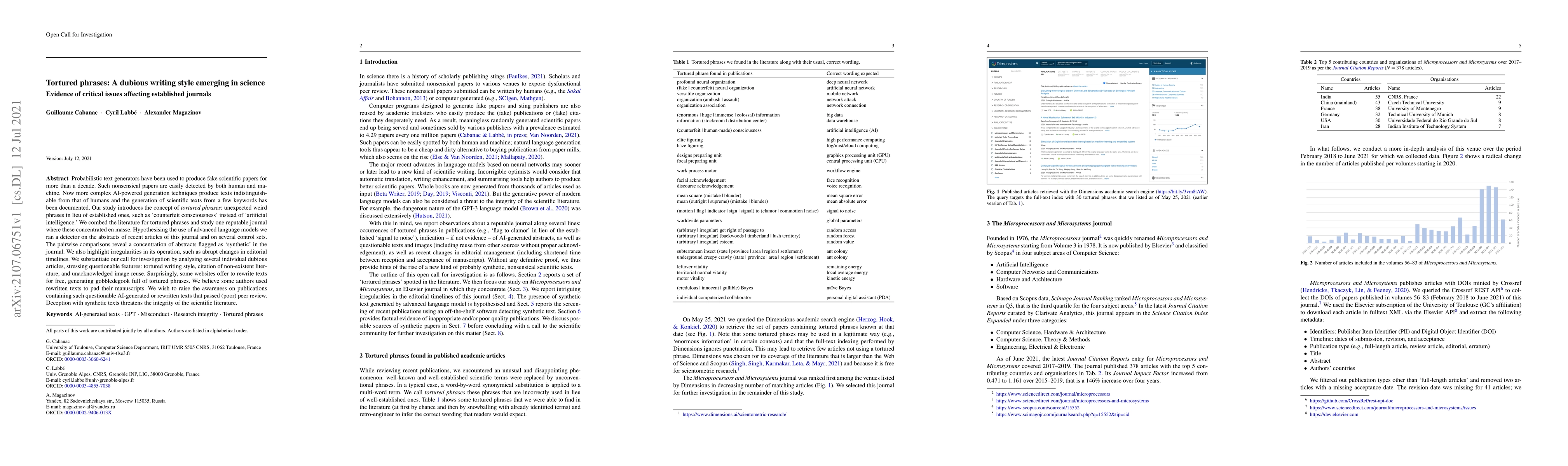 Probabilistic text generators have been used to produce fake scientific papers for more than a decade. Such nonsensical papers are easily detected by both human and machine. Now more complex AI-powered generation techniques produce texts indistinguishable from that of humans and the generation of scientific texts from a few keywords has been documented. Our study introduces the concept of tortured phrases: unexpected weird phrases in lieu of established ones, such as 'counterfeit consciousness' instead of 'artificial intelligence.' We combed the literature for tortured phrases and study one reputable journal where these concentrated en masse. Hypothesising the use of advanced language models we ran a detector on the abstracts of recent articles of this journal and on several control sets. The pairwise comparisons reveal a concentration of abstracts flagged as 'synthetic' in the journal. We also highlight irregularities in its operation, such as abrupt changes in editorial timelines. We substantiate our call for investigation by analysing several individual dubious articles, stressing questionable features: tortured writing style, citation of non-existent literature, and unacknowledged image reuse. Surprisingly, some websites offer to rewrite texts for free, generating gobbledegook full of tortured phrases. We believe some authors used rewritten texts to pad their manuscripts. We wish to raise the awareness on publications containing such questionable AI-generated or rewritten texts that passed (poor) peer review. Deception with synthetic texts threatens the integrity of the scientific literature.
