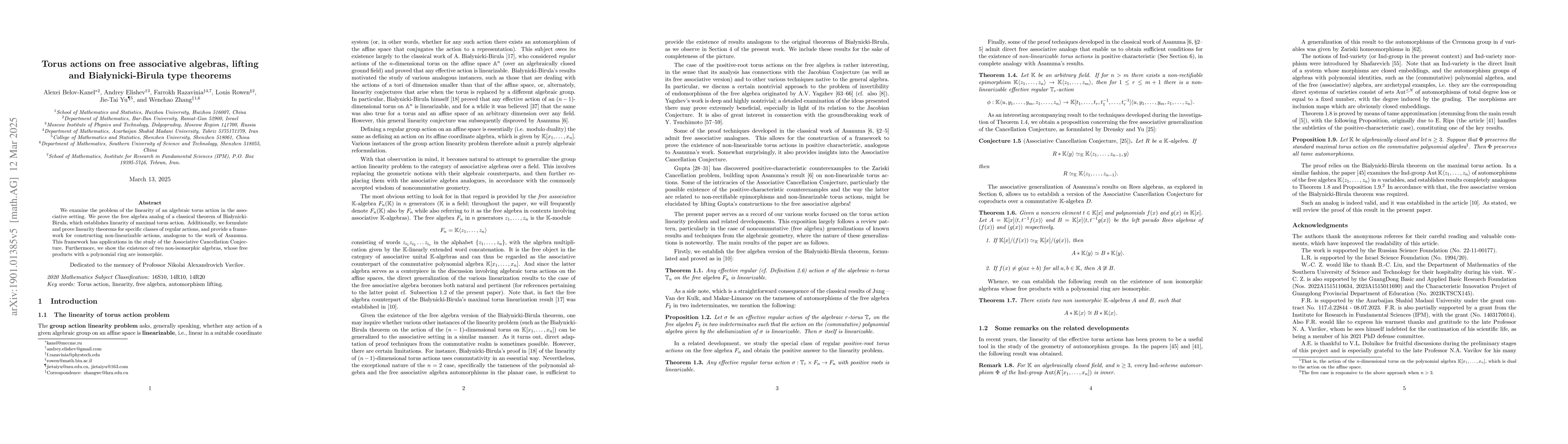 This paper investigates torus actions on free associative algebras, proving the free algebra analogue of Białynicki-Birula's theorem on maximal torus action linearity, and develops a framework for constructing non-linearizable actions relevant to the associative cancellation conjecture.